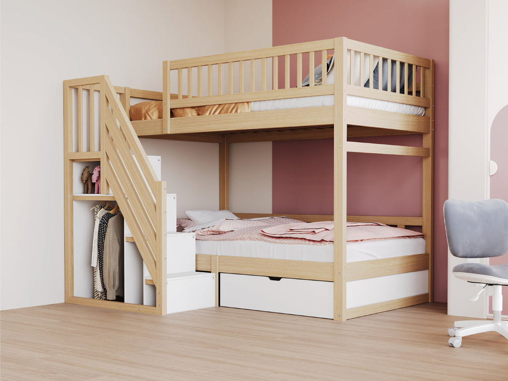 Constructed from durable solid wood, this bed is built to last, even with daily use. Its simple and modern style complements a variety of interior designs. This double bed combines sleeping and storage functions, offering a space-saving solution to create a safe, comfortable, and well-organized sleeping environment for your child.