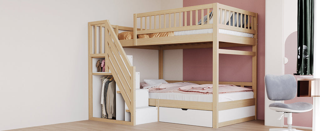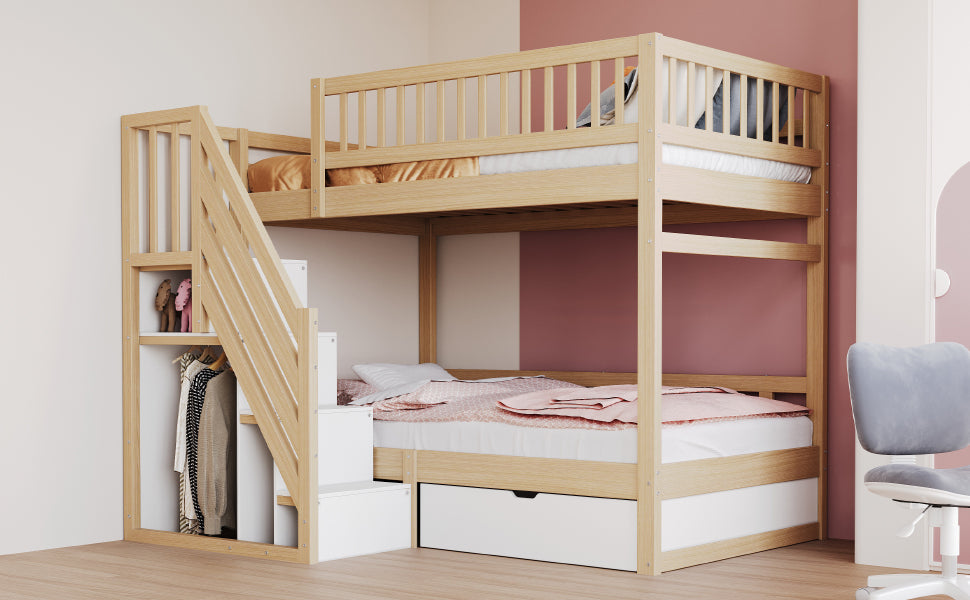 The upper bunk bed is equipped with high safety rails to ensure a safe sleeping environment. The sturdy side ladder features storage cabinets for small items, toys, or books. The bunk bed also includes spacious drawers on the lower bunk for storing bedding, seasonal clothing, or personal items.