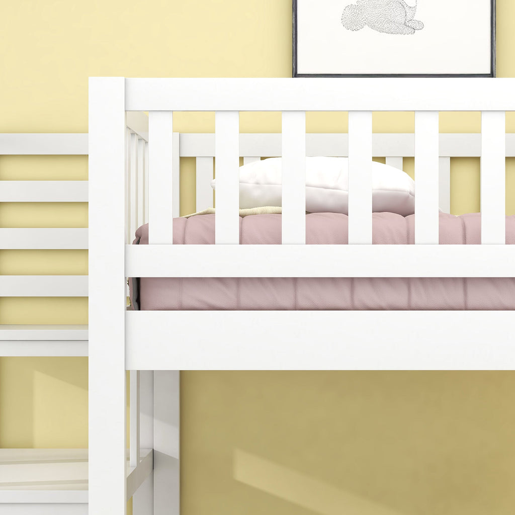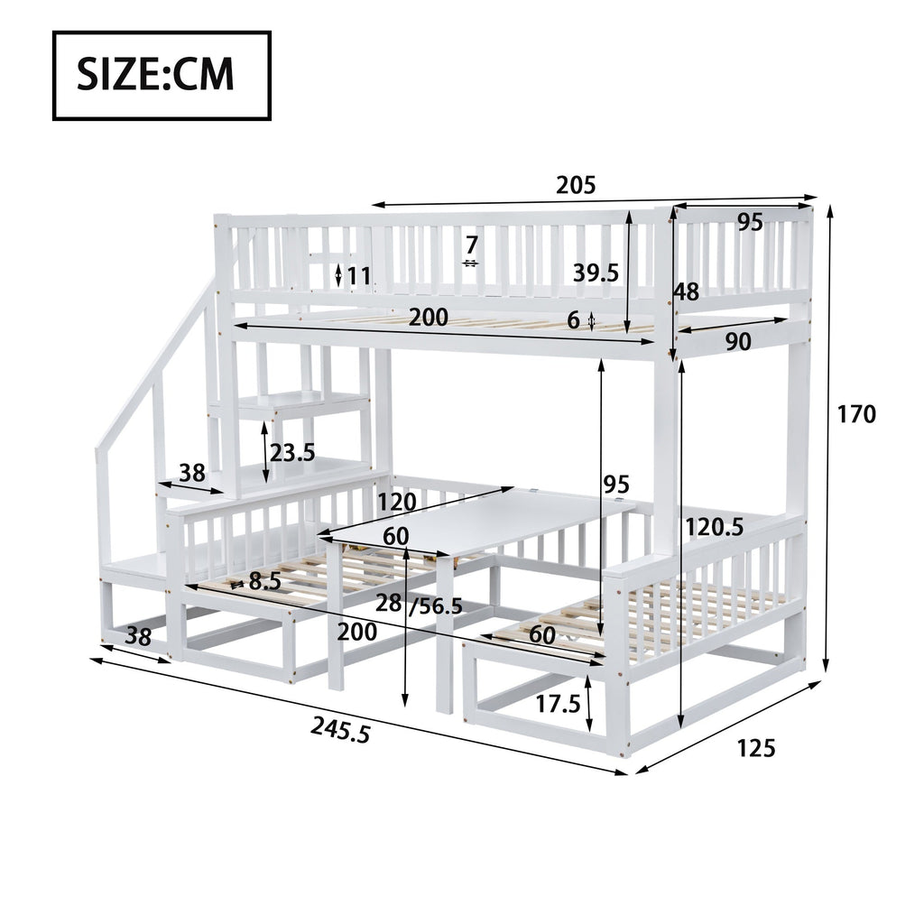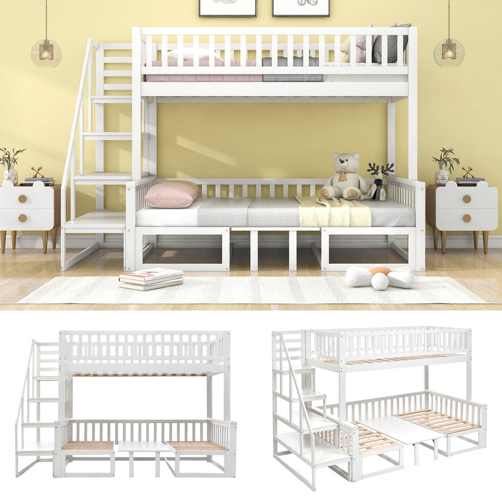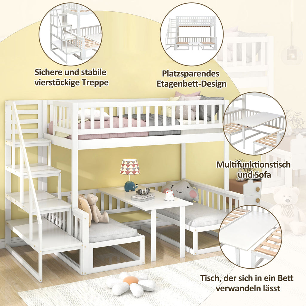 Bunk Bed, Space-Saving with Stairs, Adjustable Table, Wooden Sofa, Pine Wood, White