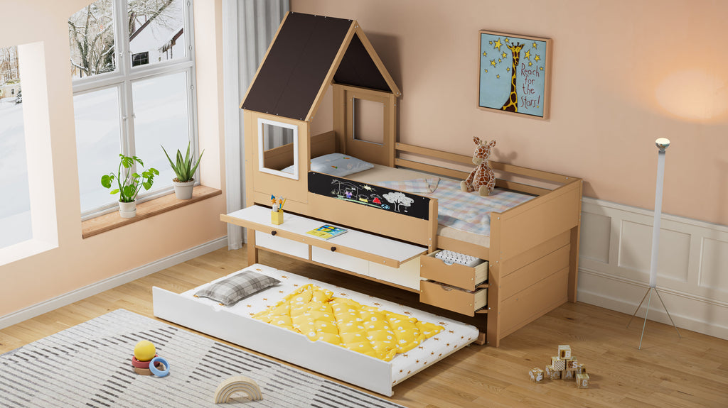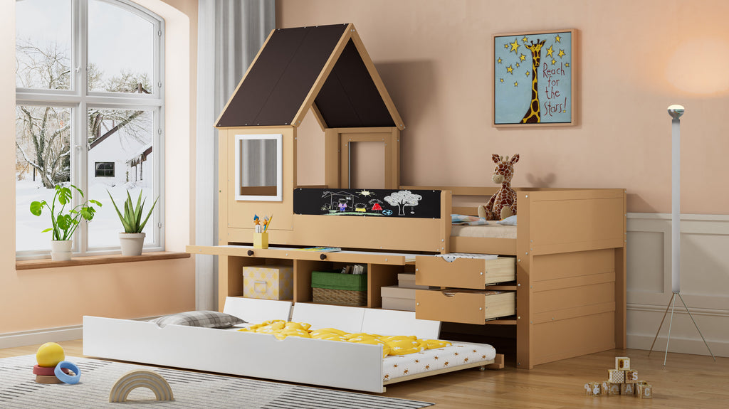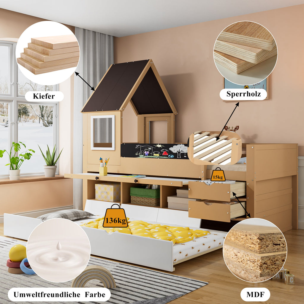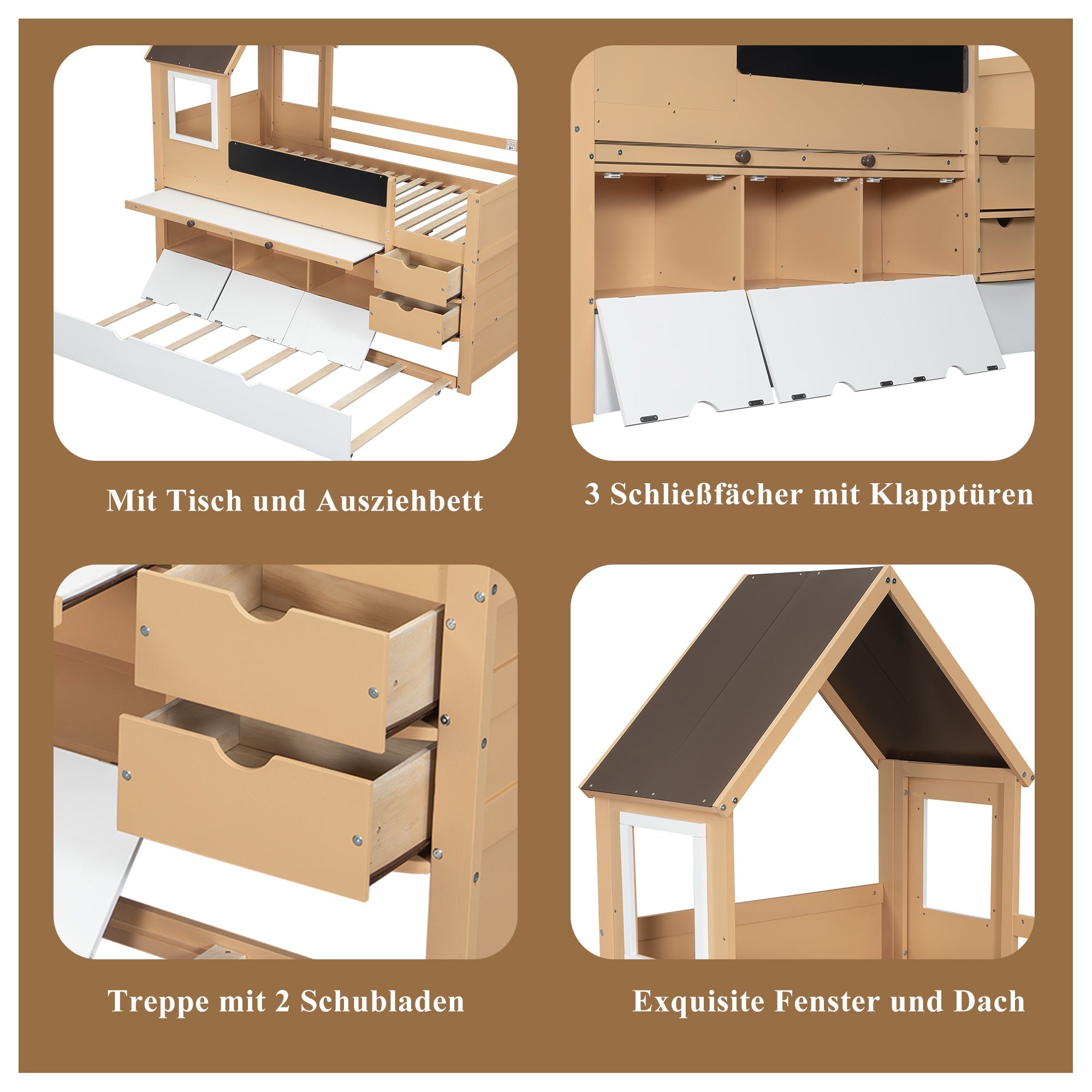 Bunk Bed, Treehouse with Drawers, Pull-Out Bed & Table, Pine+MDF White+Natural