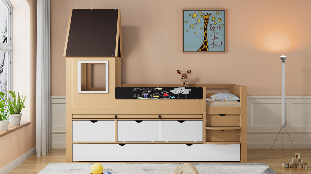 The patchwork of white and brown creates a warm and cozy atmosphere, ideal for a child's room or a small bedroom. The small window at the head of the bed adds charm and doubles as a decorative element. There is also storage space underneath, which not only serves as a comfortable sleeping area but also as a practical space organizer. The overall design balances functionality and aesthetics, making it an ideal choice for any home.