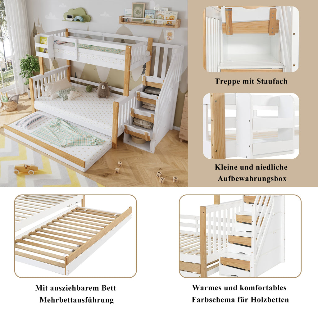 Bunk Bed with Trundle, Special Door Panel Design, Corner Stairs, Pine + MDF, White + Natural