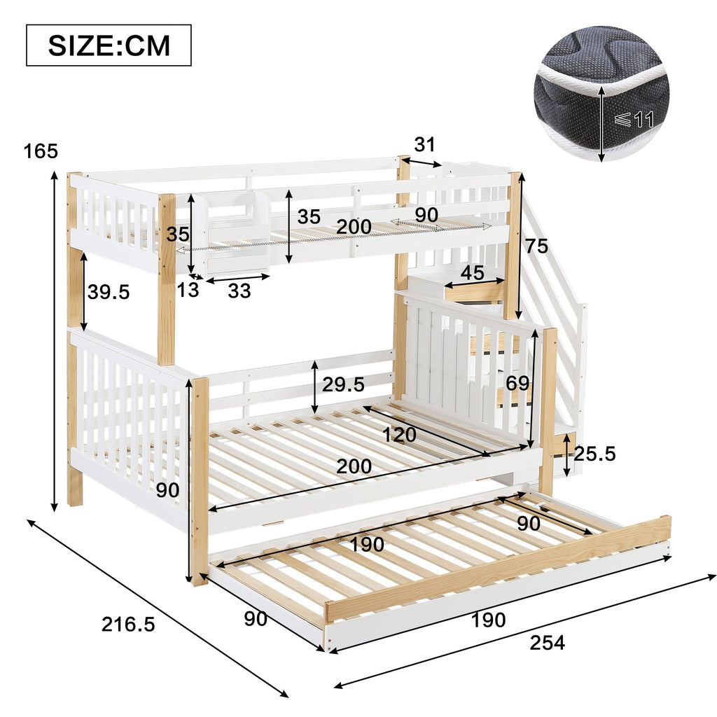Bunk Bed, Trundle & Corner Stairs, Pine + MDF, White + Natural