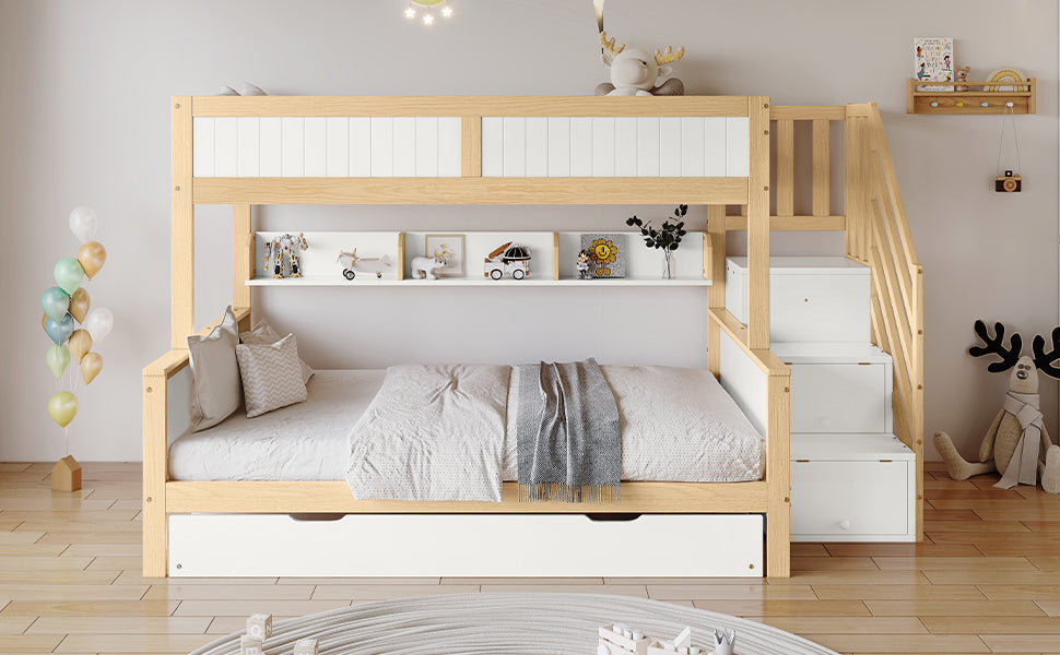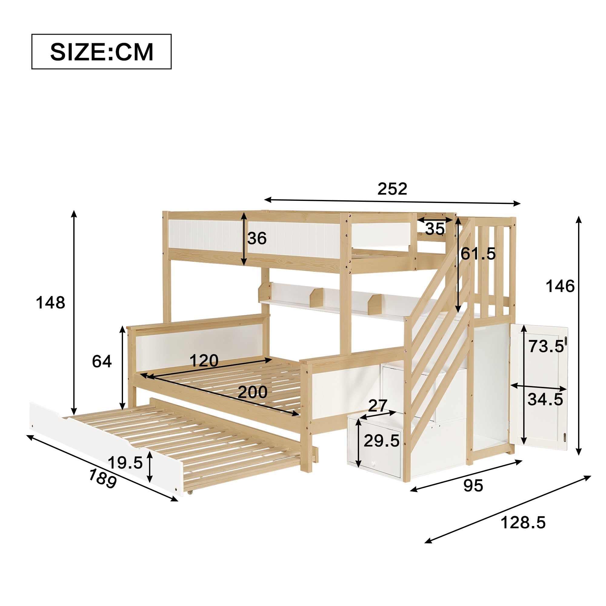 Bunk Bed, Trundle & Wardrobe, Corner Stairs, Pine+MDF, White+Natural