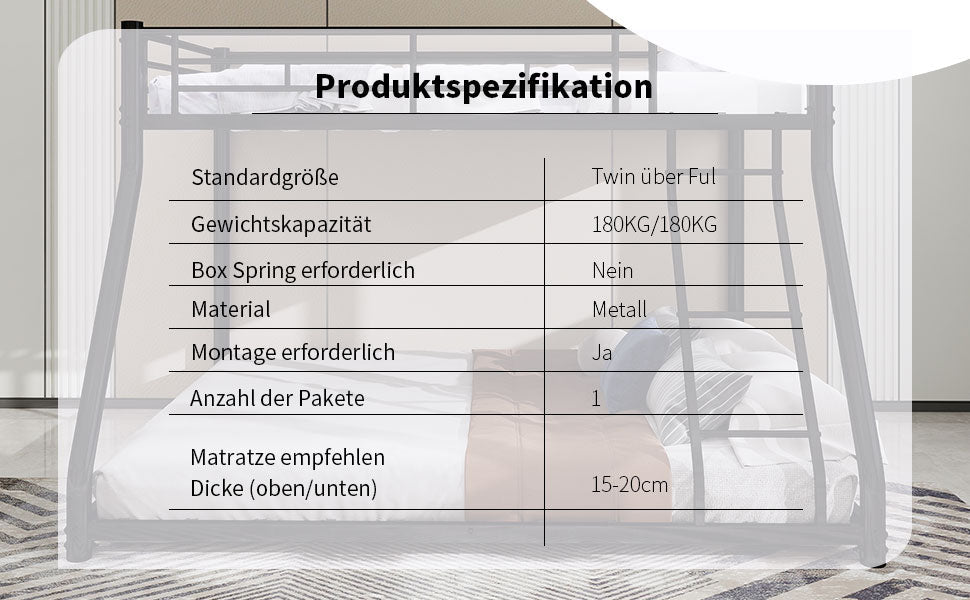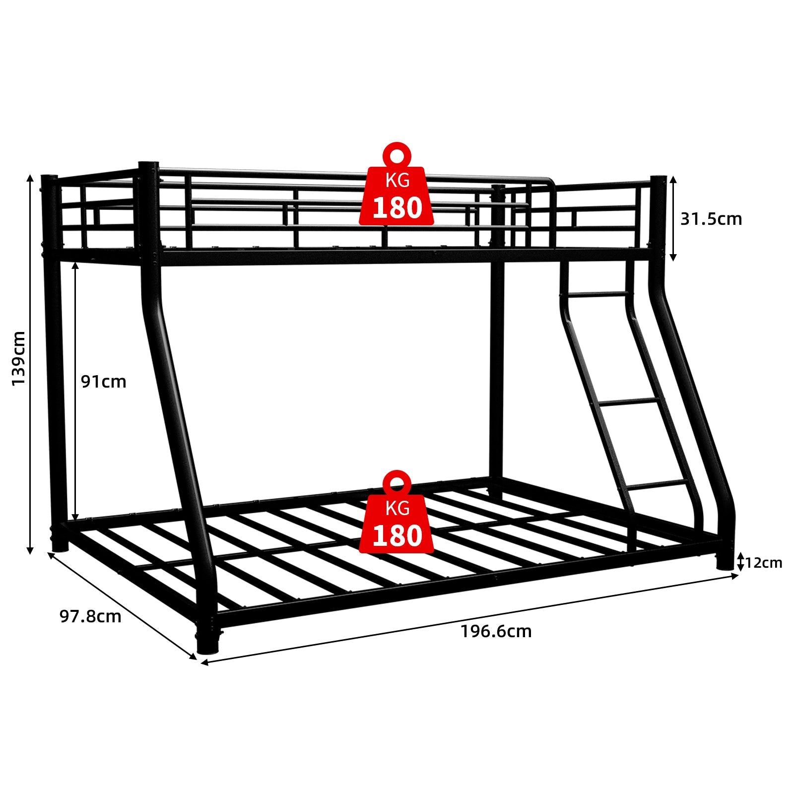 Overall dimensions are 196.6 cm x 147.8 cm x 138 cm. The weight capacity is 200 kg for the upper bunk and 200 kg for the lower bunk, making our bunk beds suitable for various occasions.