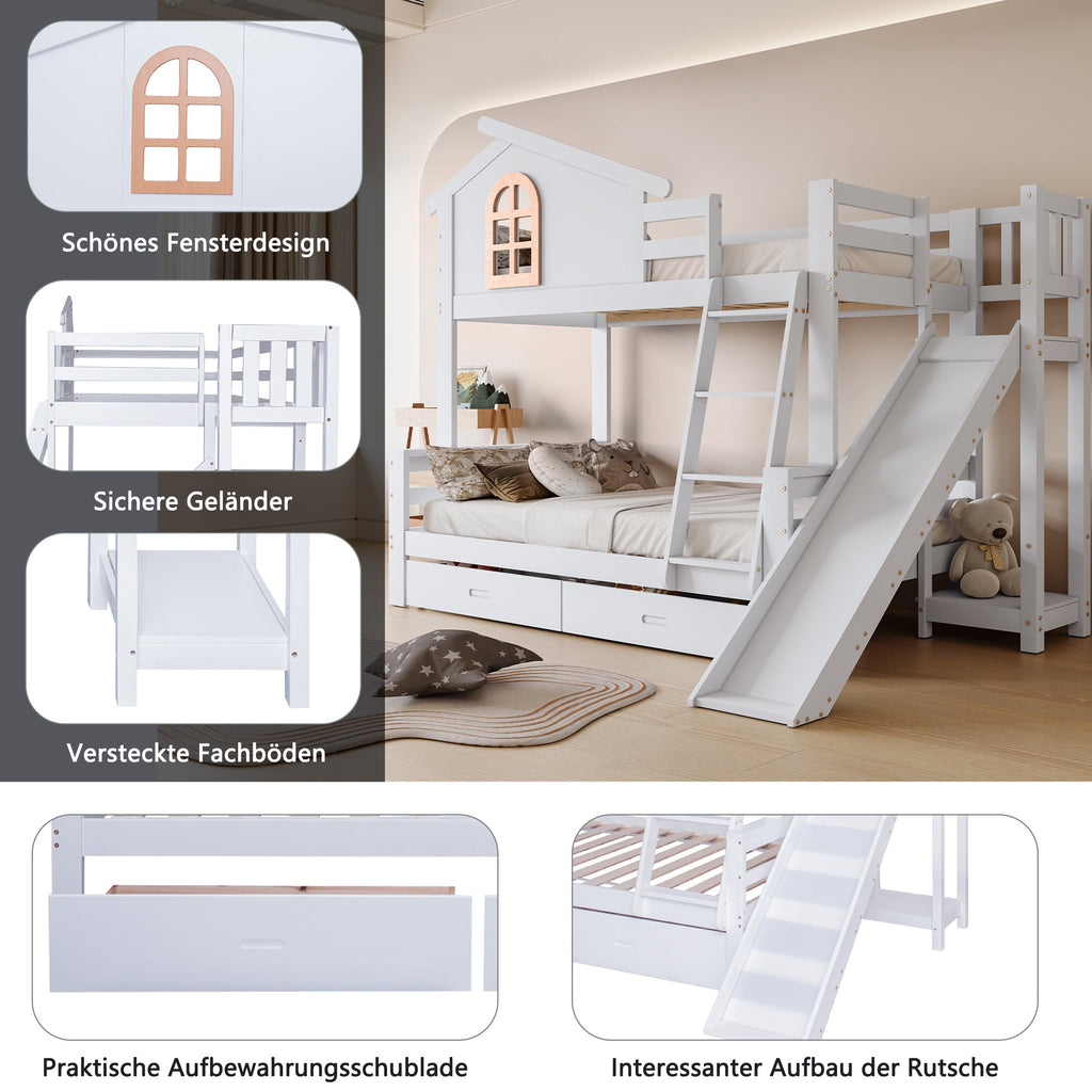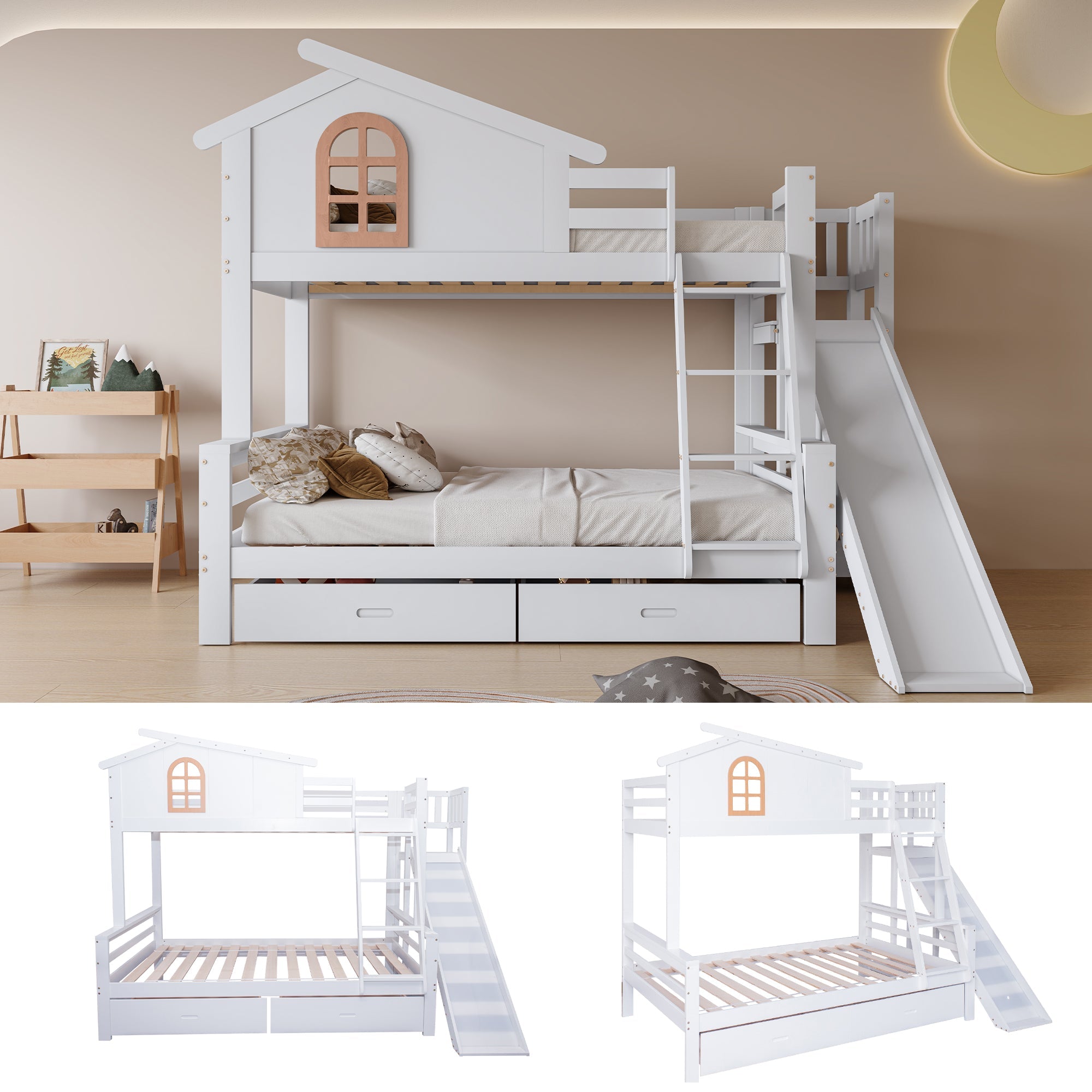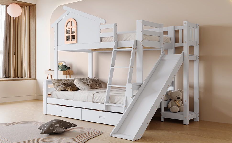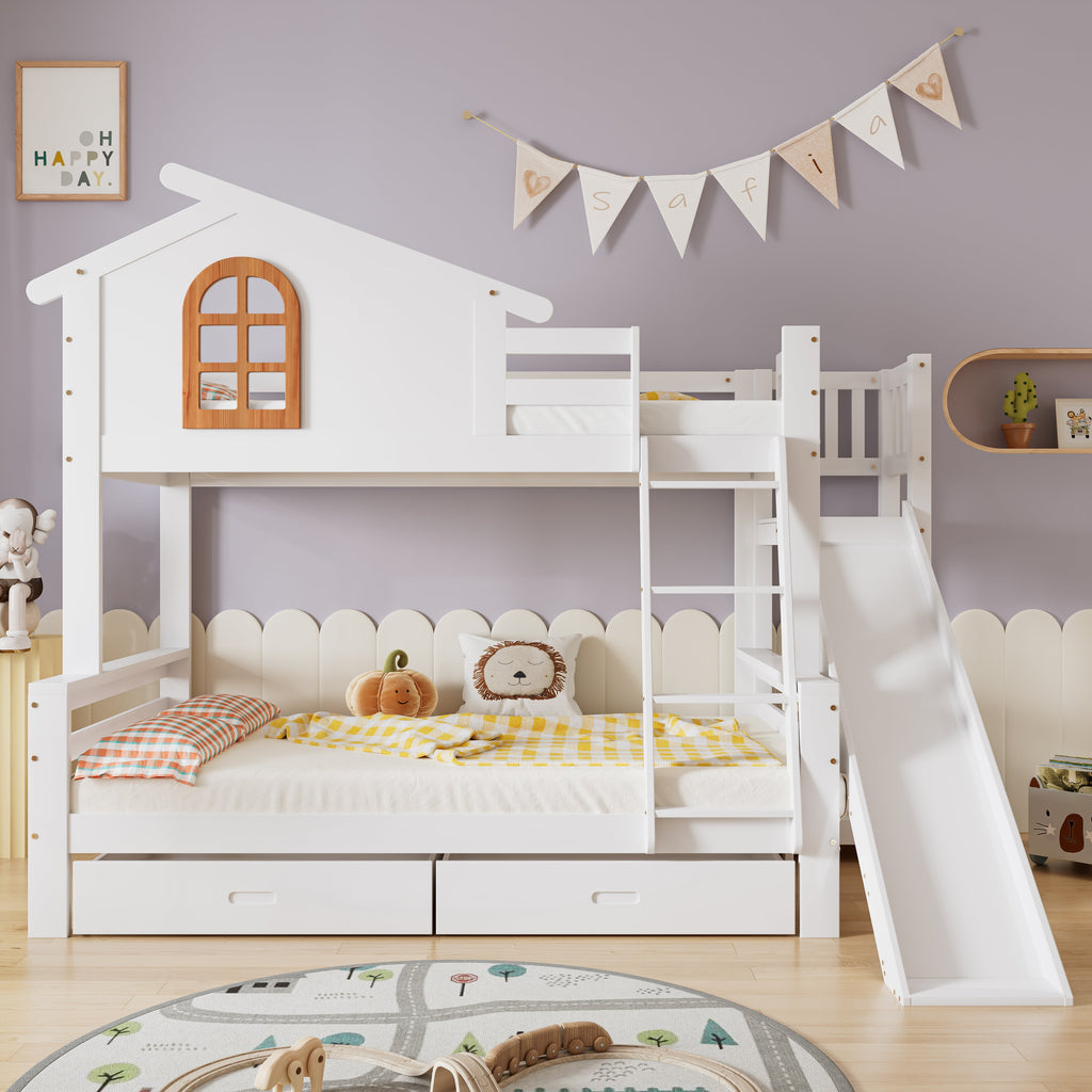 Bunk Bed, Windows, Tilting Staircase, Slide & Drawers, Solid Wood, White