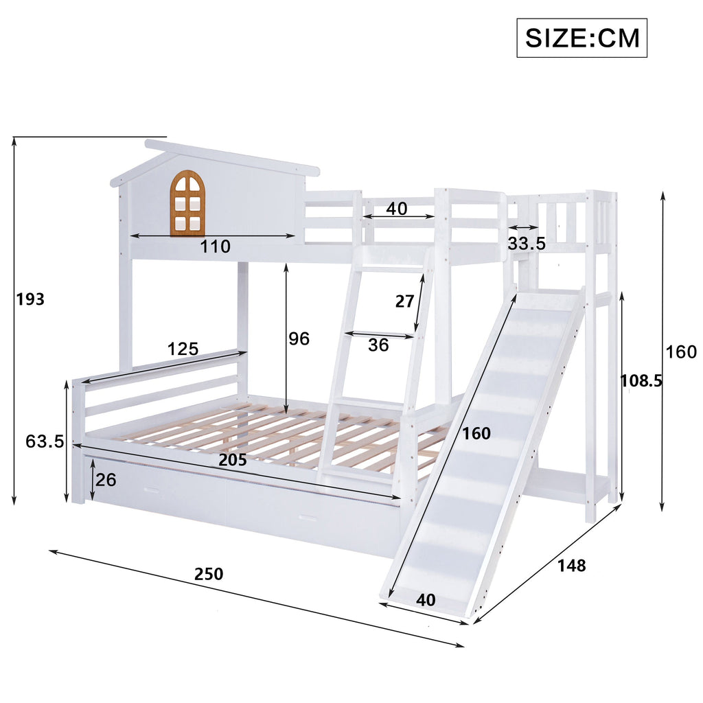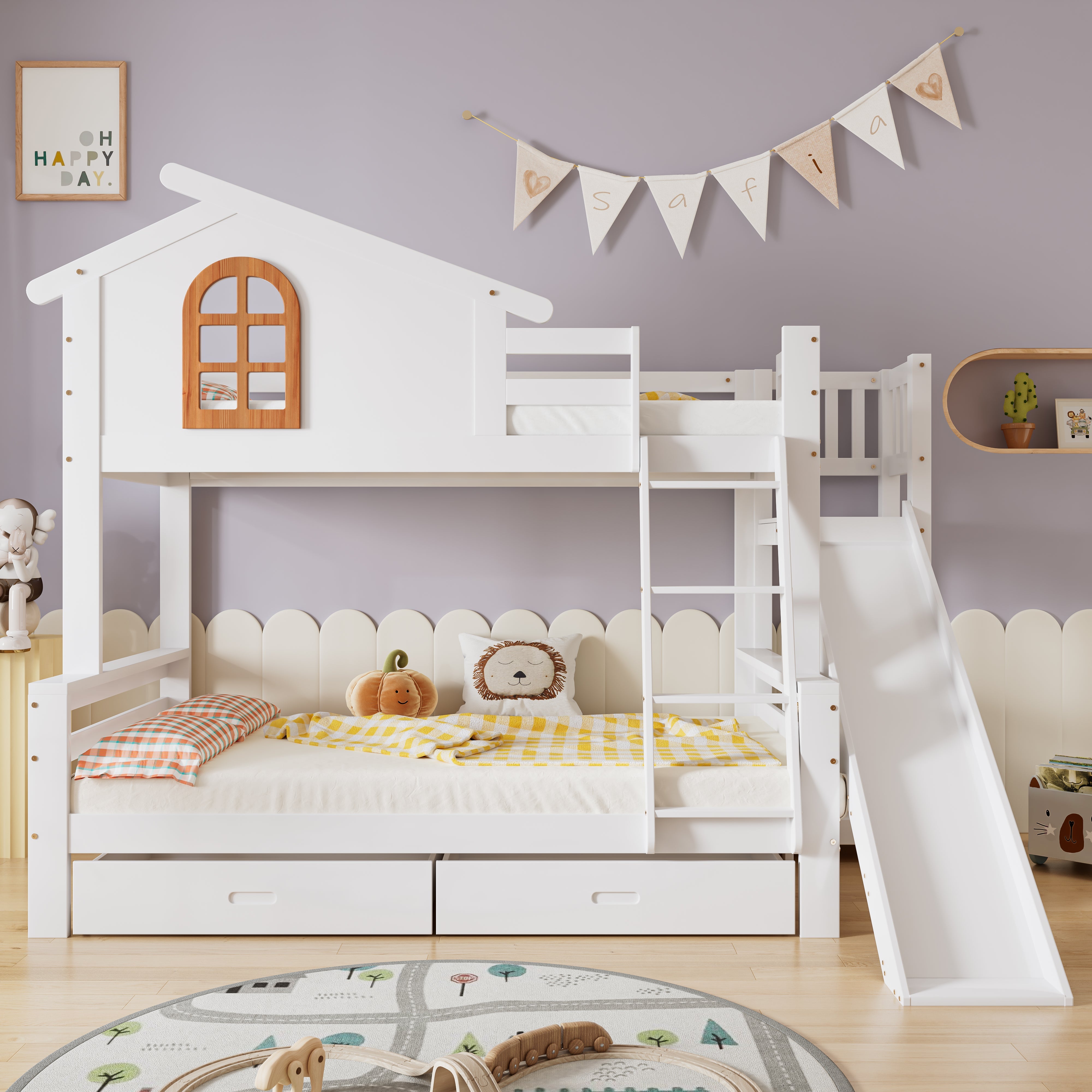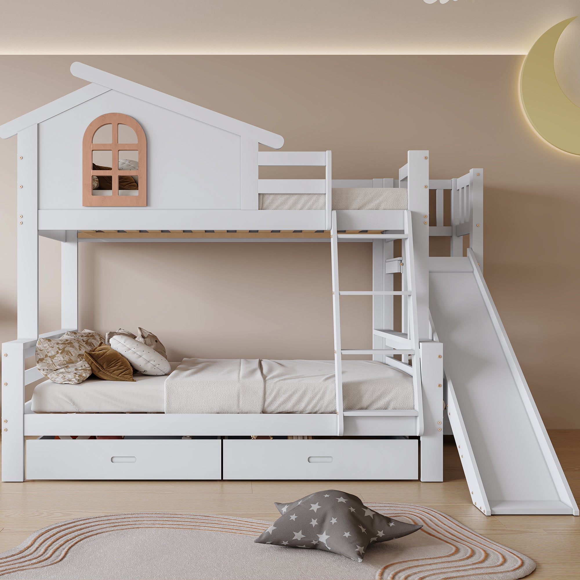Bunk Bed, Windows, Tilting Staircase, Slide & Drawers, Solid Wood, White