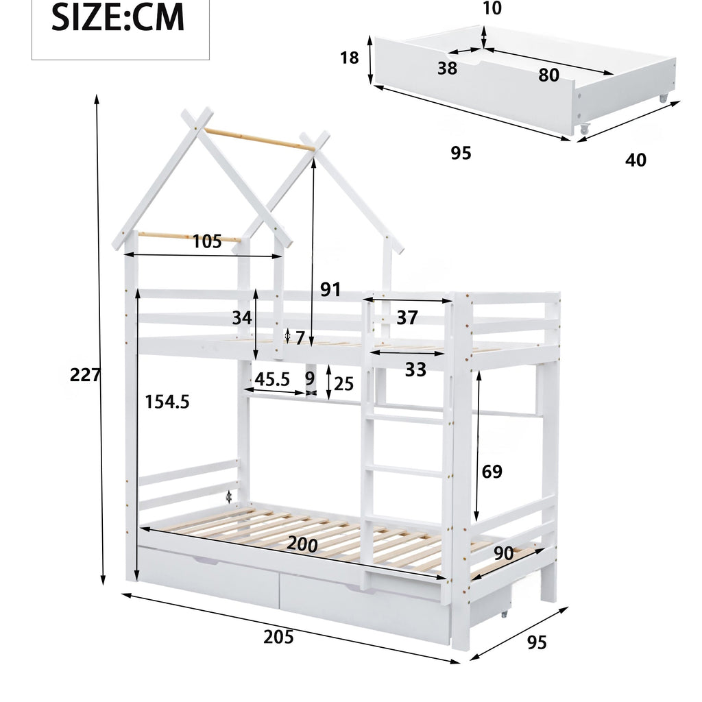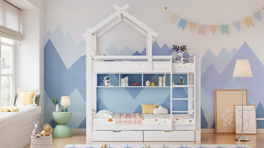 Bunk Bed with Drawers, Shelves & Ladder, Pinewood Frame, White