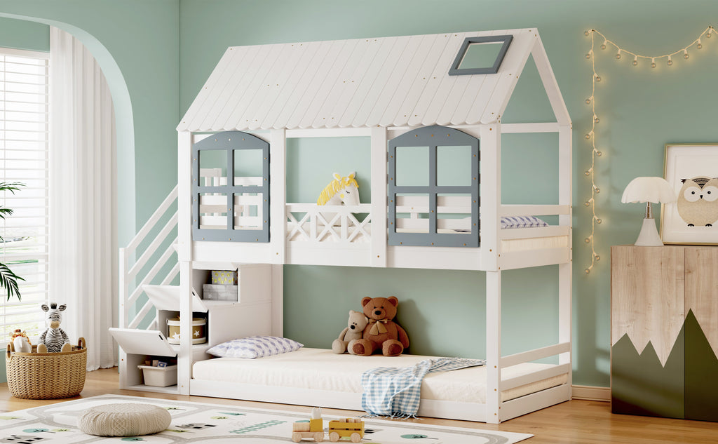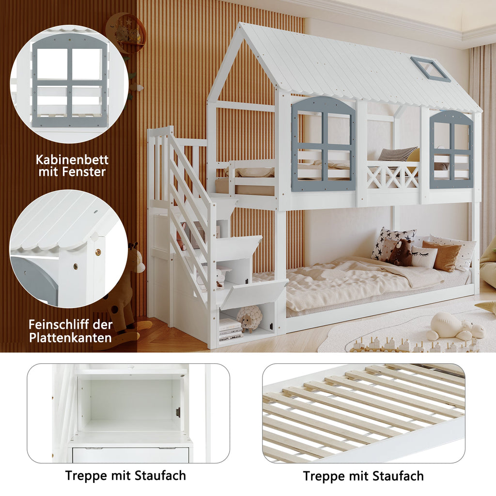 Bunk Bed with Roof & Window, Safety Gate & 3 Stair Lockers, 90x200cm Pine+MDF White+Grey