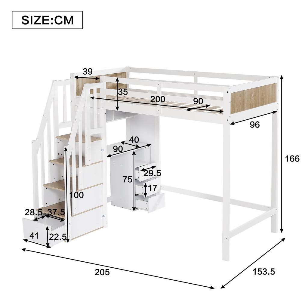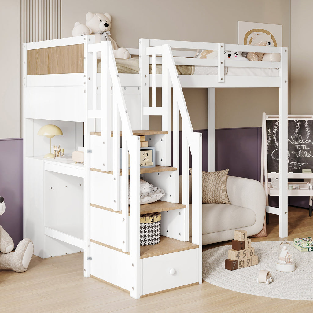 Bunk Bed with Safety Gate, Desk & Storage, Pine+MDF White+Natural