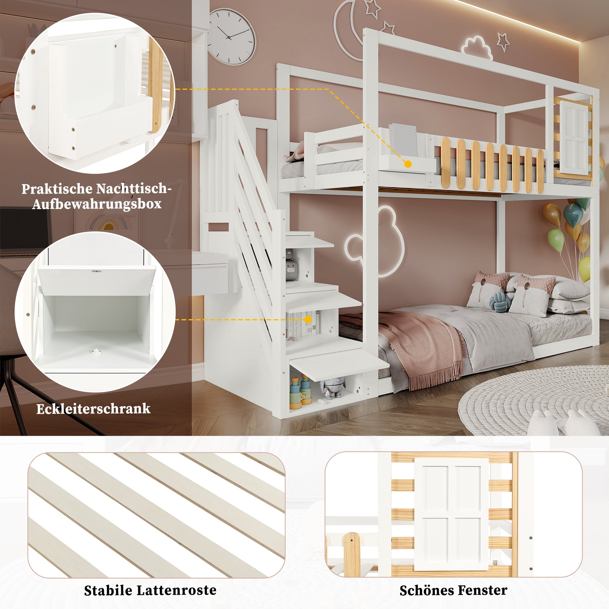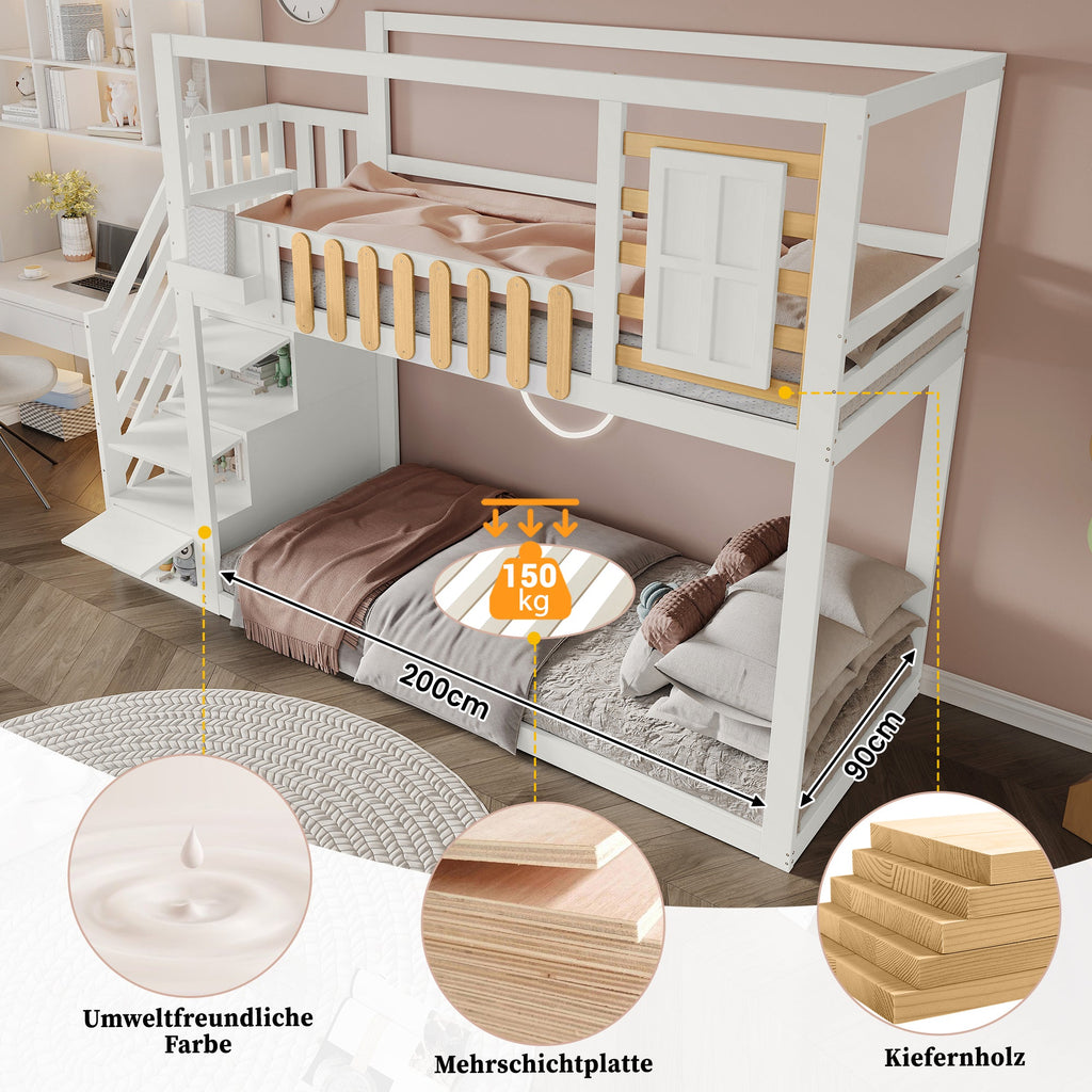 Bunk bed with stairs, window, and storage drawer, solid pine frame, children's bed.