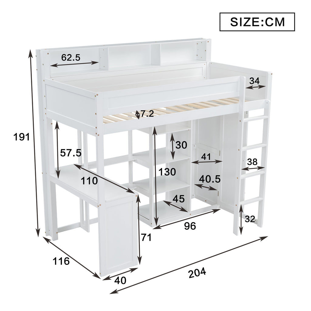 Bunk Bed with Table & Wardrobe, Safety Gate & Shelves, Pine+MDF+Plywood, White, 90x200cm