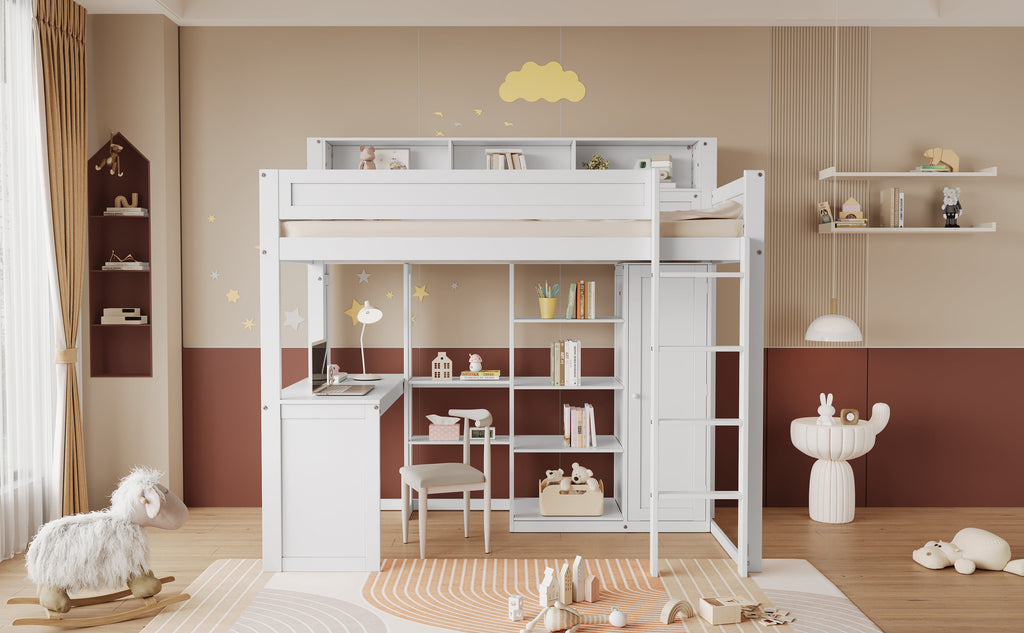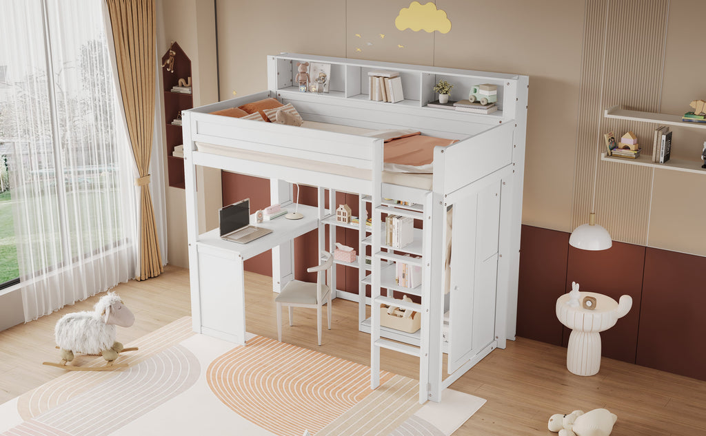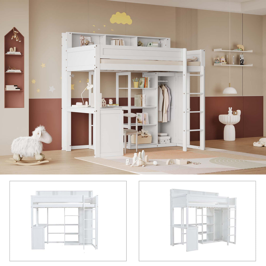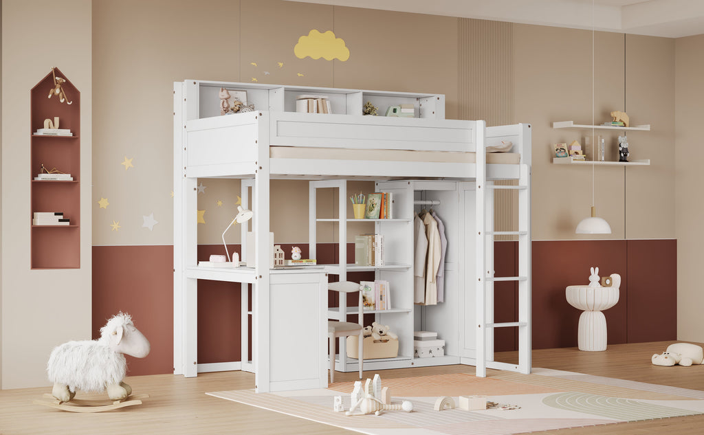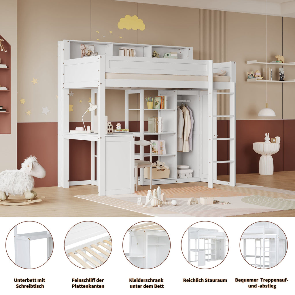 Bunk Bed with Table and Wardrobe, with Safety Rail and Shelves, White, 90x200cm