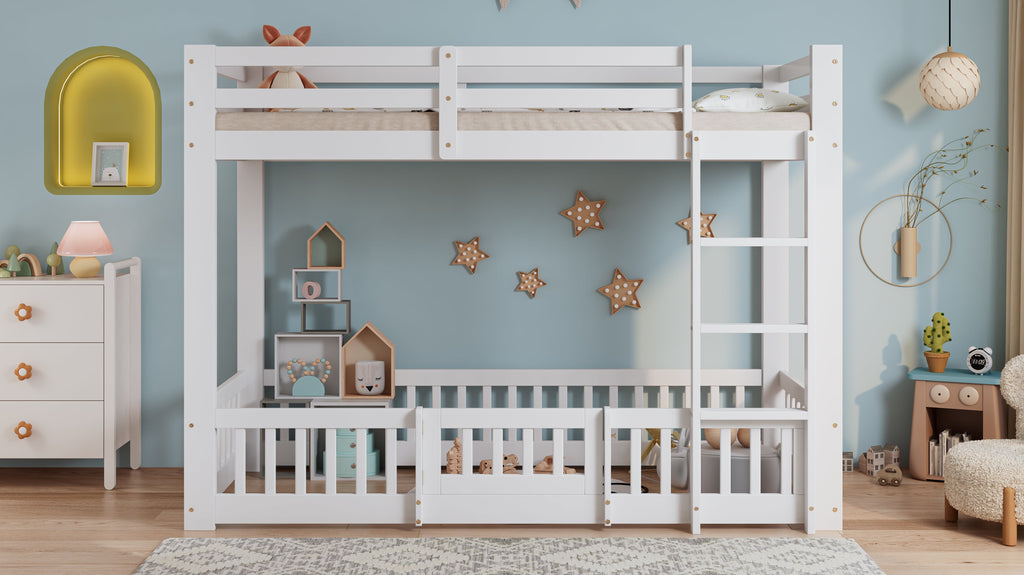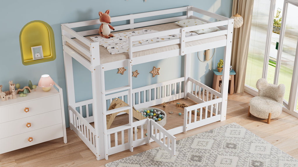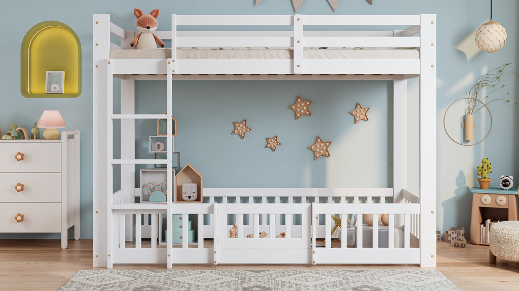 Bunk Bed, Wooden with Right-Angled Stairs, Railing, Fall Protection, White