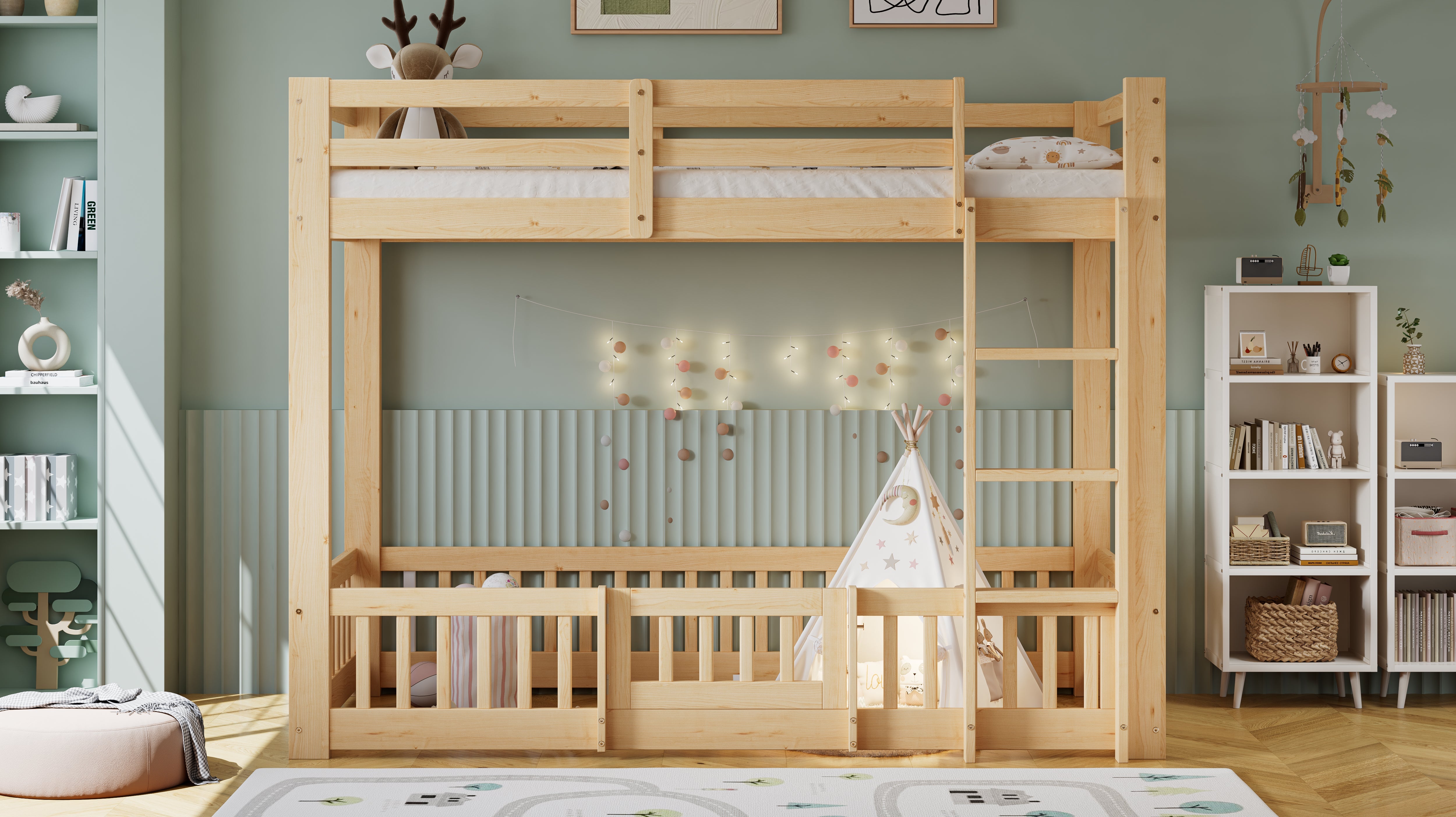 This charming children's bed combines safety, functionality, and design potential. A spacious area beneath the bed can be used as a play area, reading corner, or additional storage space, ideal for unleashing imagination. The four-sided railings ensure maximum safety while sleeping or playing, while the safety gates, equipped with a small door, provide safe access for play and create a fun "mini-house" atmosphere. Built on a solid wooden structure with a simple and safe three-step right-angled ladder, the bed guarantees longevity and stable access to the upper bunk. Its clean lines and versatile wooden construction seamlessly fit into modern or classic decor styles, making it a versatile and charming centerpiece for any child's room.
