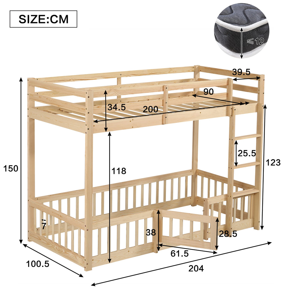 Bunk Bed, Wooden Bed, Pine + LVL, with Right-Angle Staircase, with Railing and Door, Natural, 90x200cm