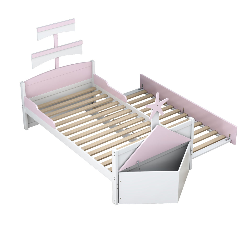 Children's Bed 90*200, Sailboat Shape with Pull-Out Bed & Storage, Pink Wood