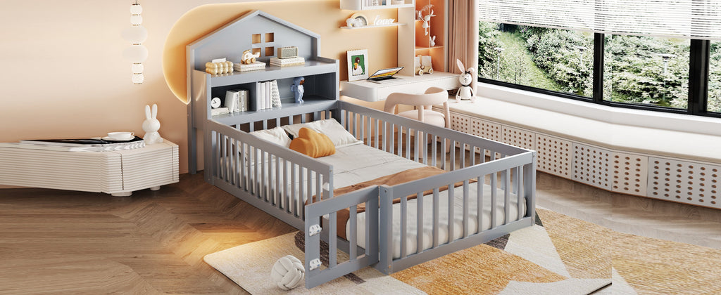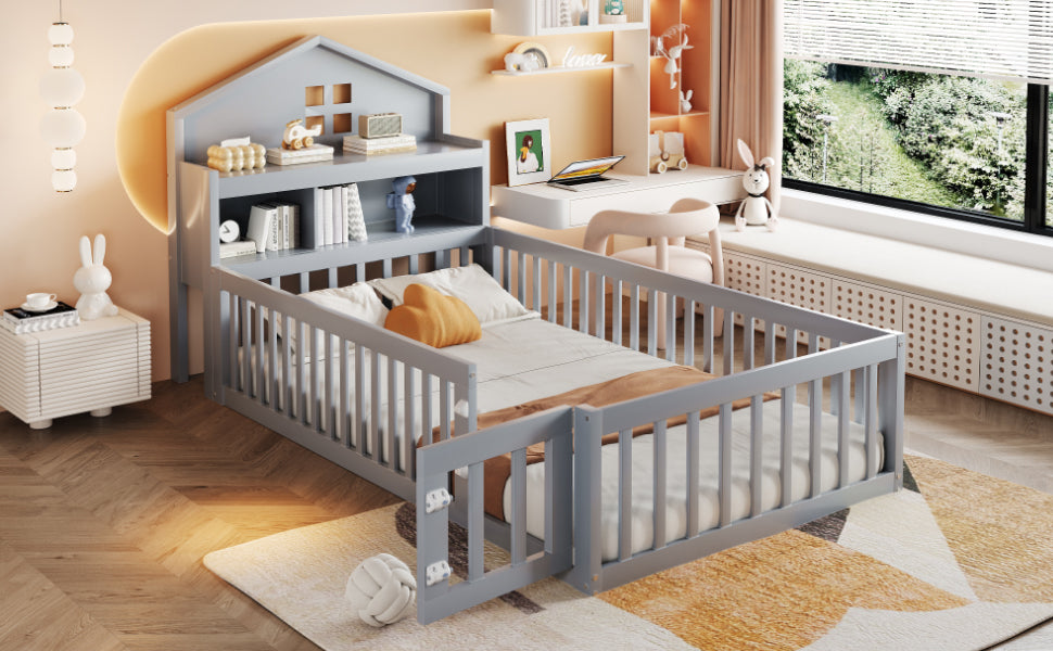 Children's Bed 90 x 200, Solid Wood Frame with Shelves, Storage, Safety Gate & Picture Rail, Grey