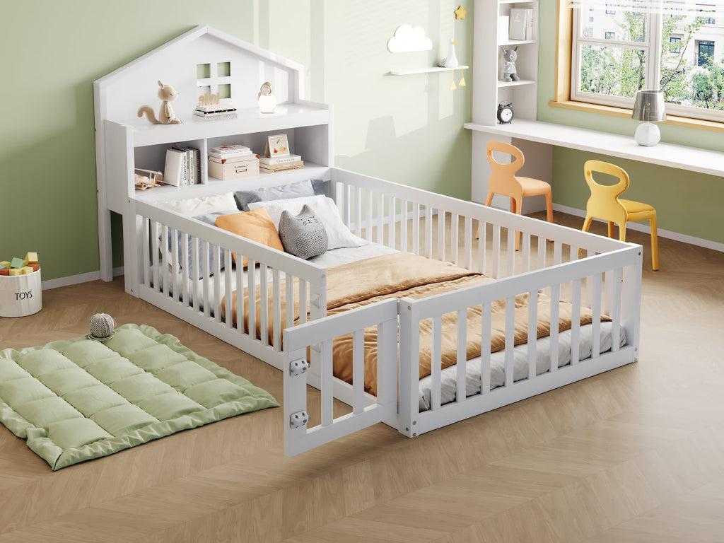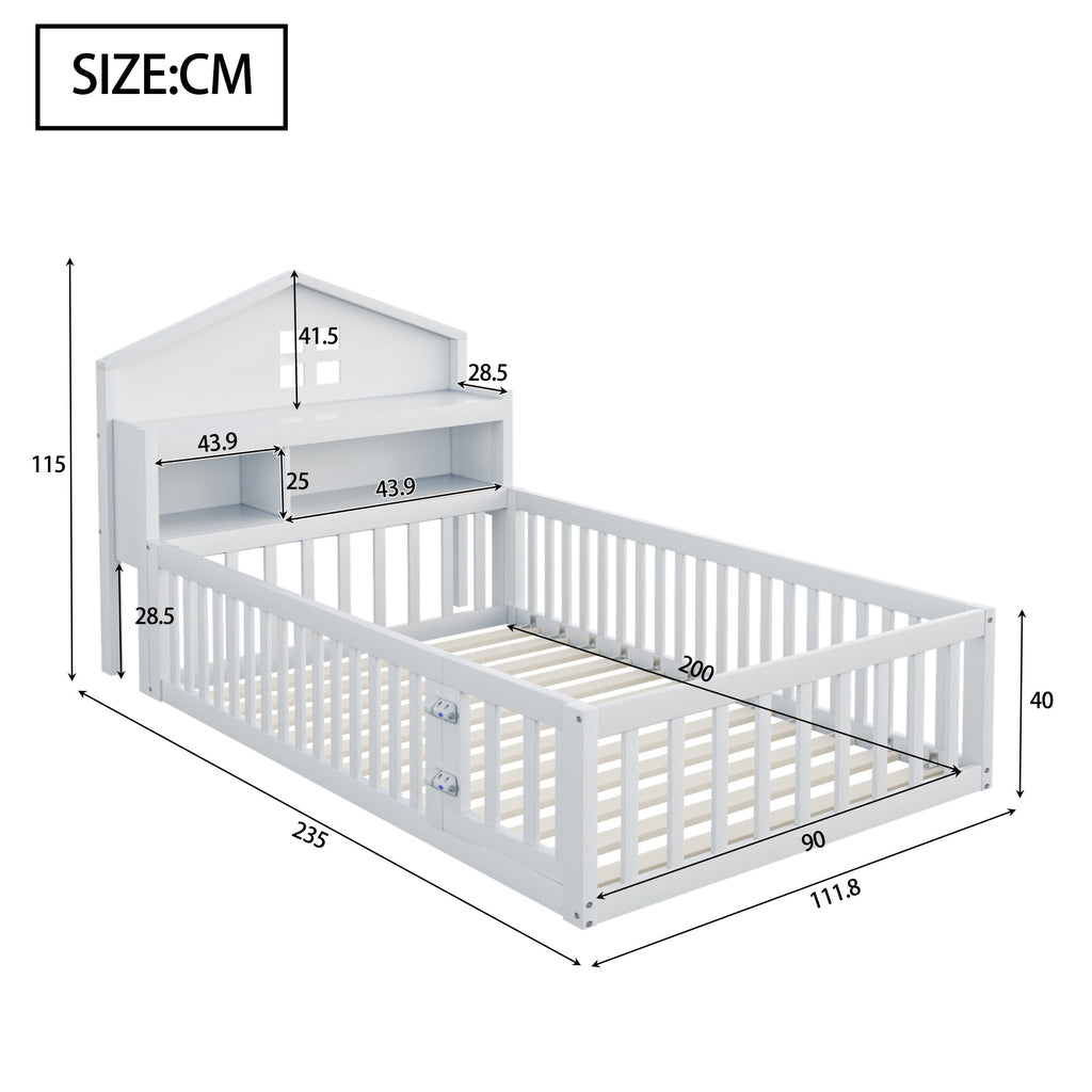 Children's Bed 90x200, Solid Wood Frame with Shelves, Storage, Safety Gate & Door, White