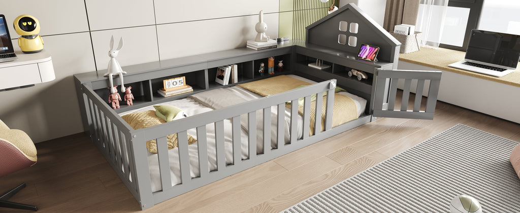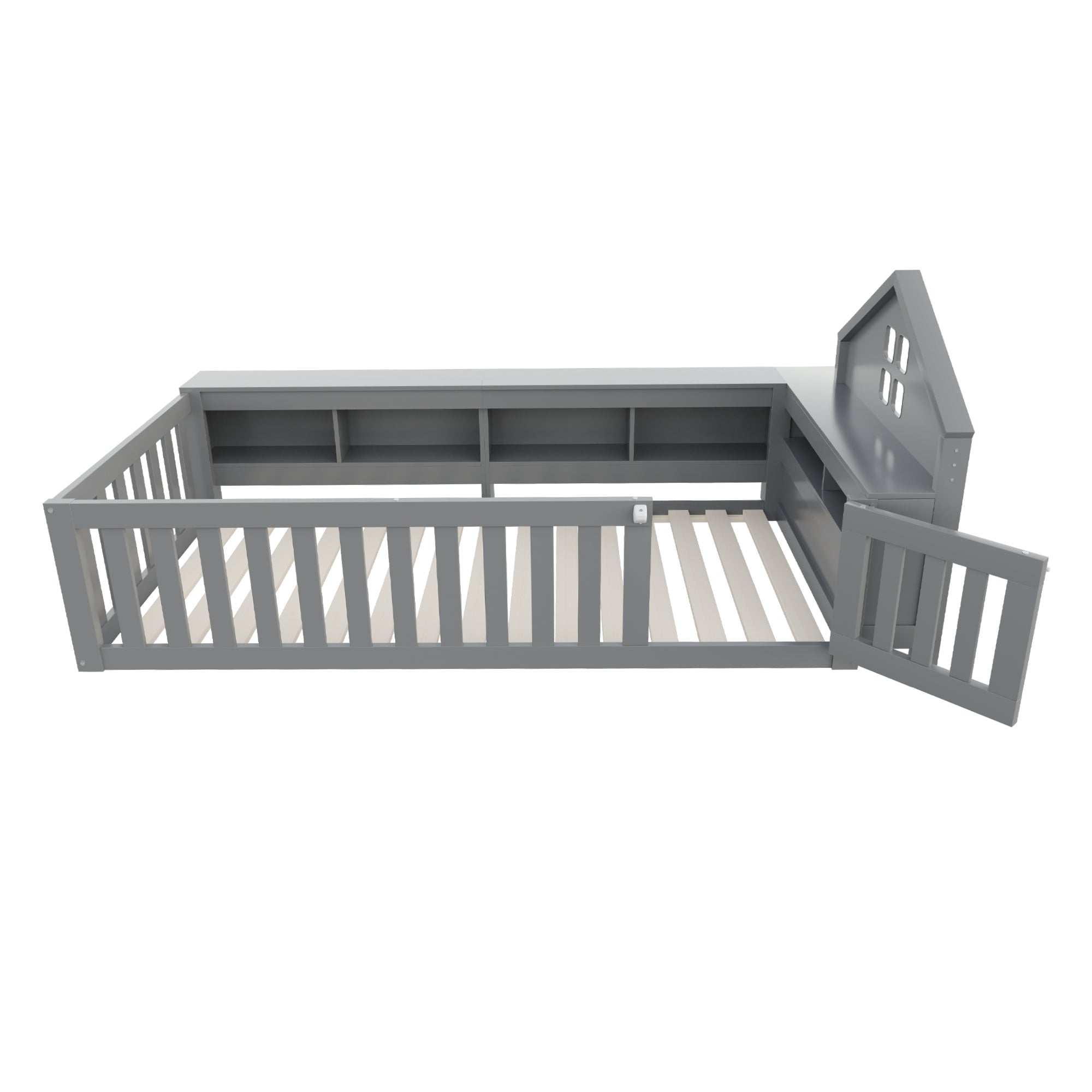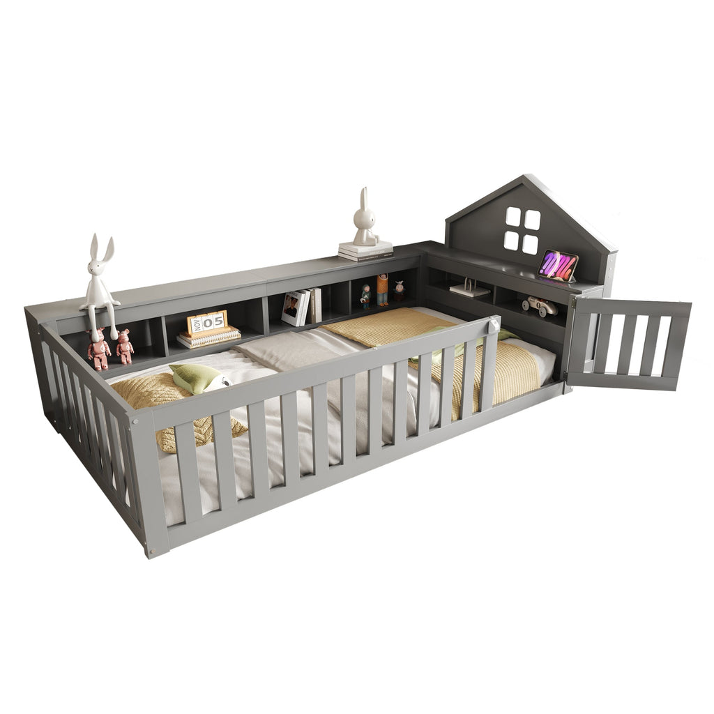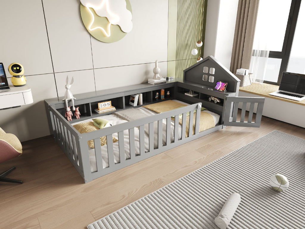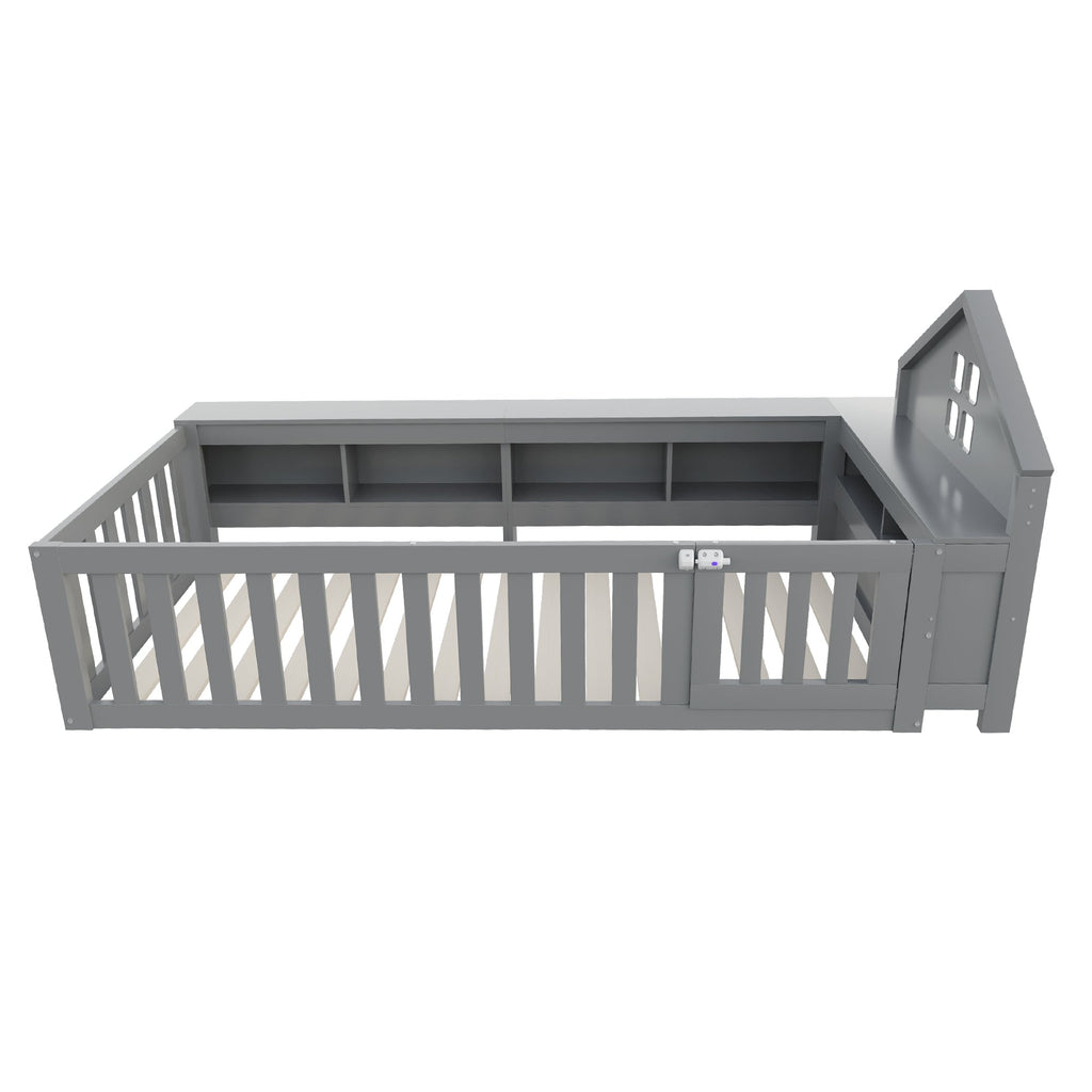 Children's Bed 90x200cm, Roof & Window, Storage, Safety Gate & Door, Solid Wood, Grey