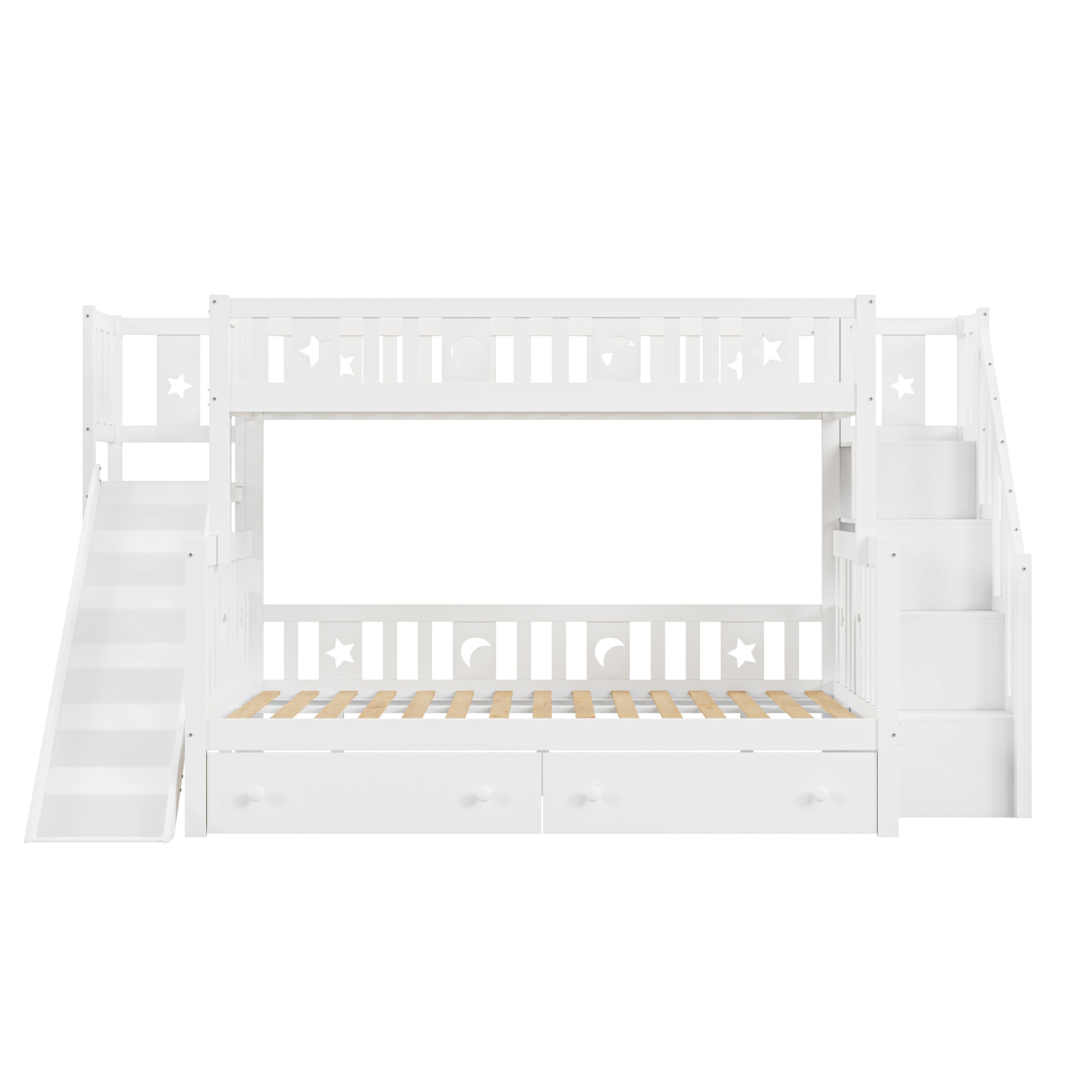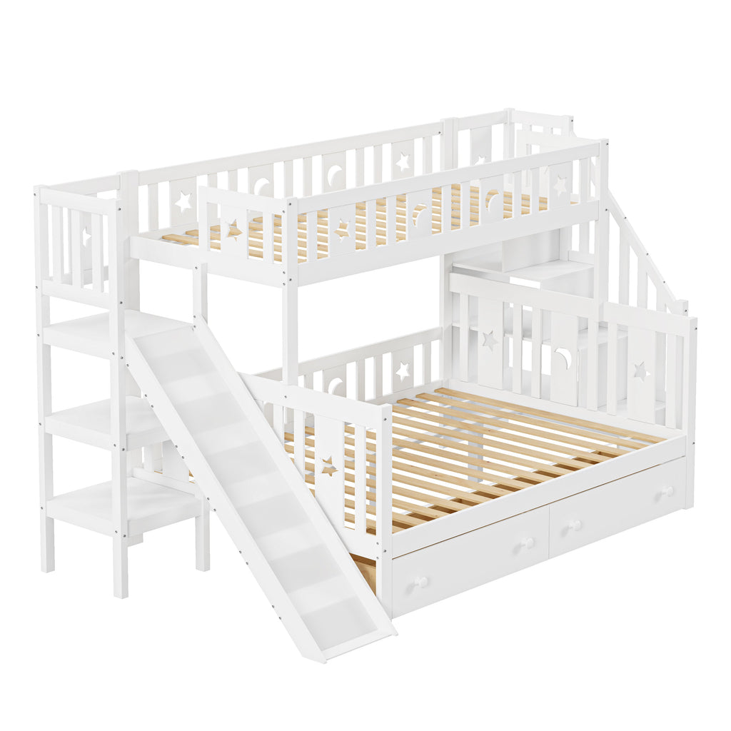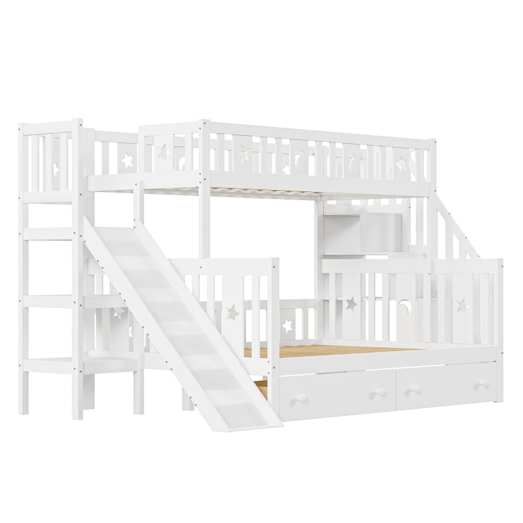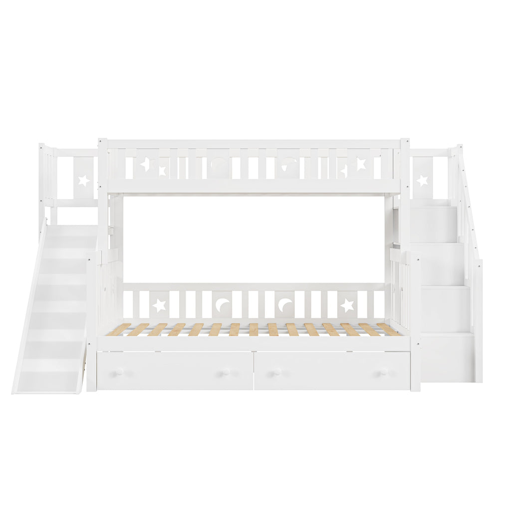 Children's Bed Bunk with Slide, Drawers, Slatted Frame, Solid Wood White