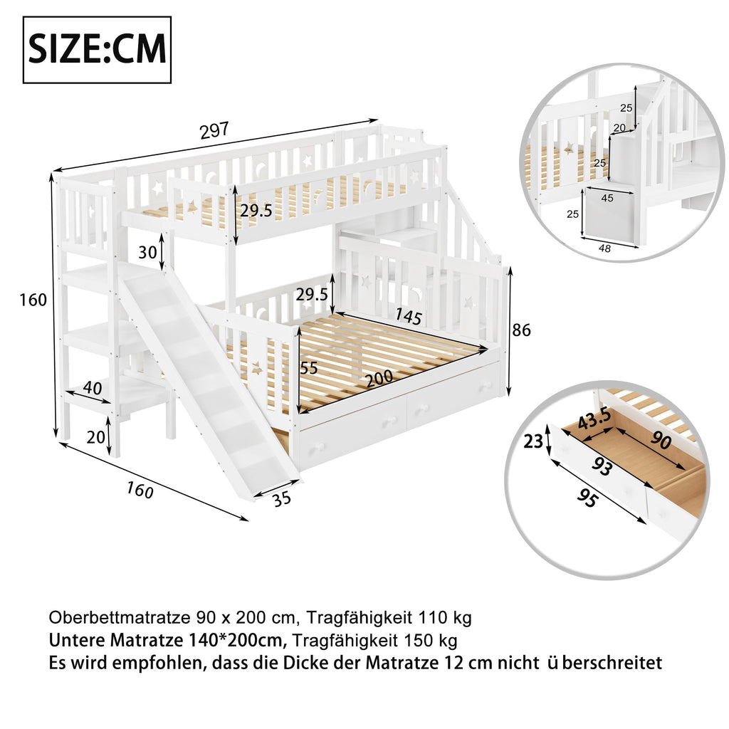 This versatile bunk bed frame for children features an upper bed measuring 90 x 200 cm and a lower bed measuring 140 x 200 cm. The bunk bed includes a safety slide and ladder on both sides, as well as an extra-large storage compartment. This design makes it easier for your child to climb while providing additional storage space to maximize the use of this solid wood bed.