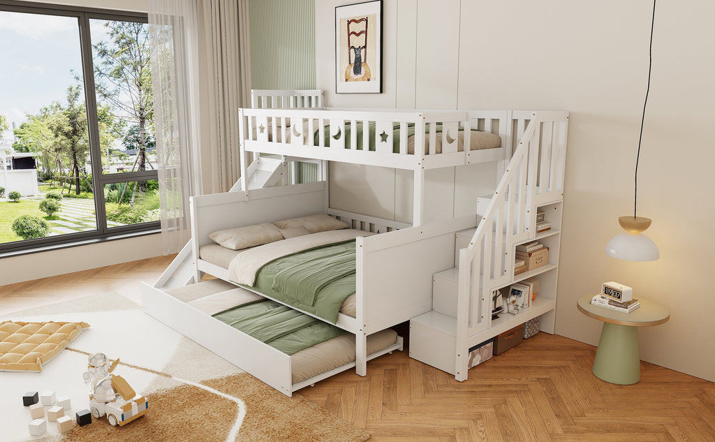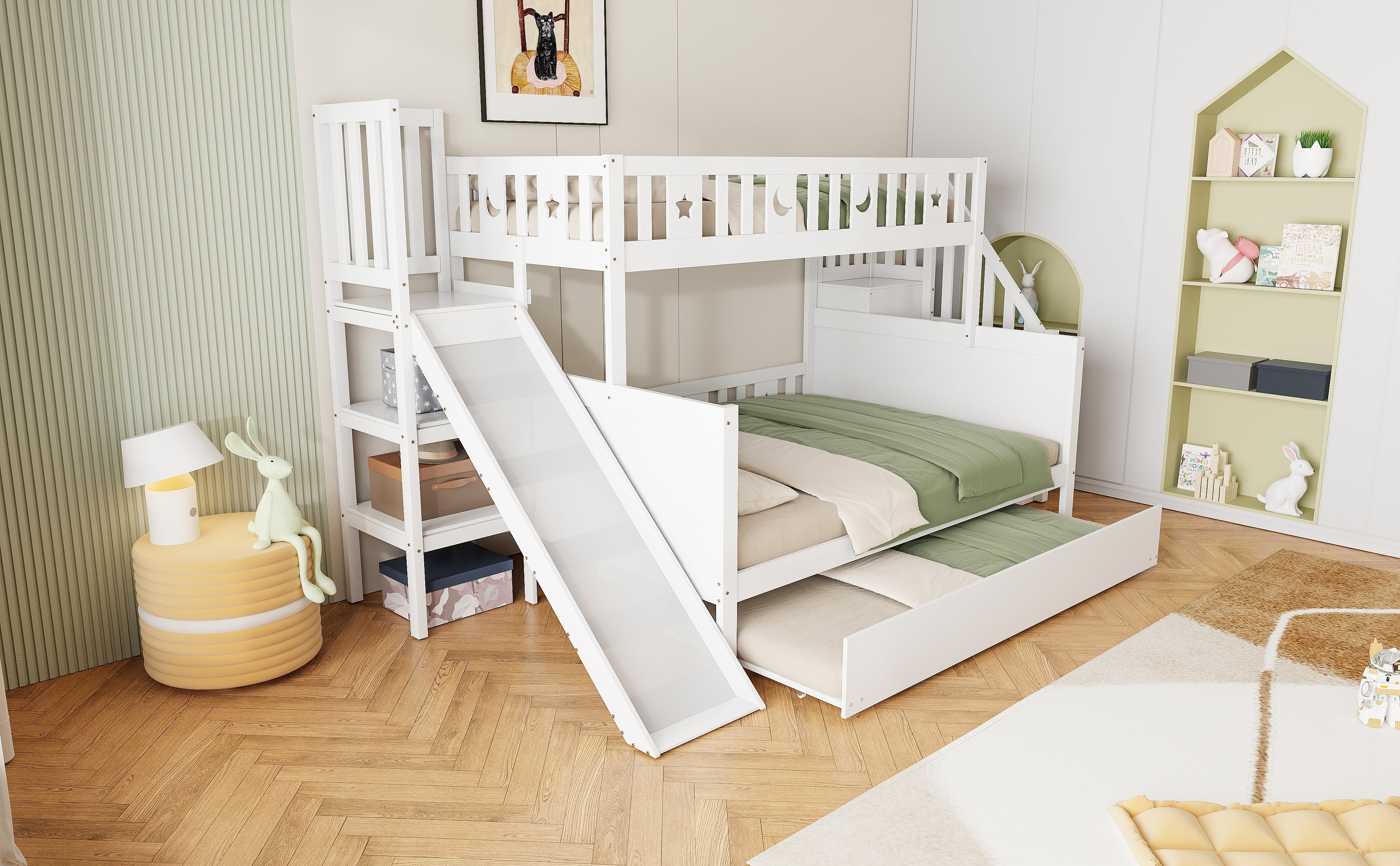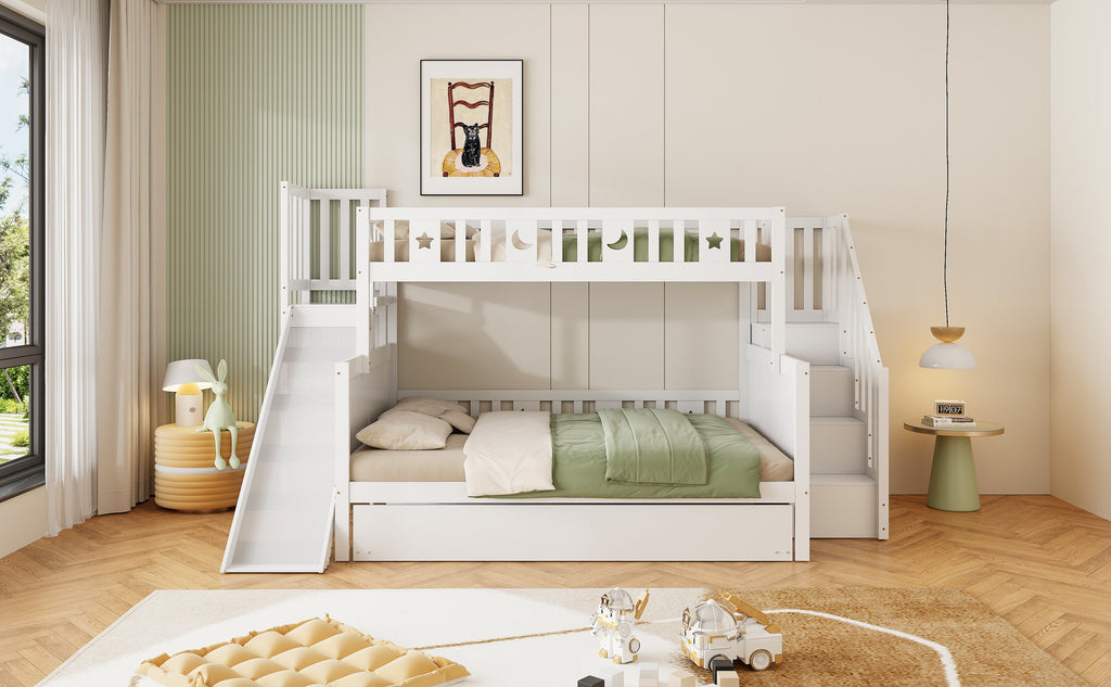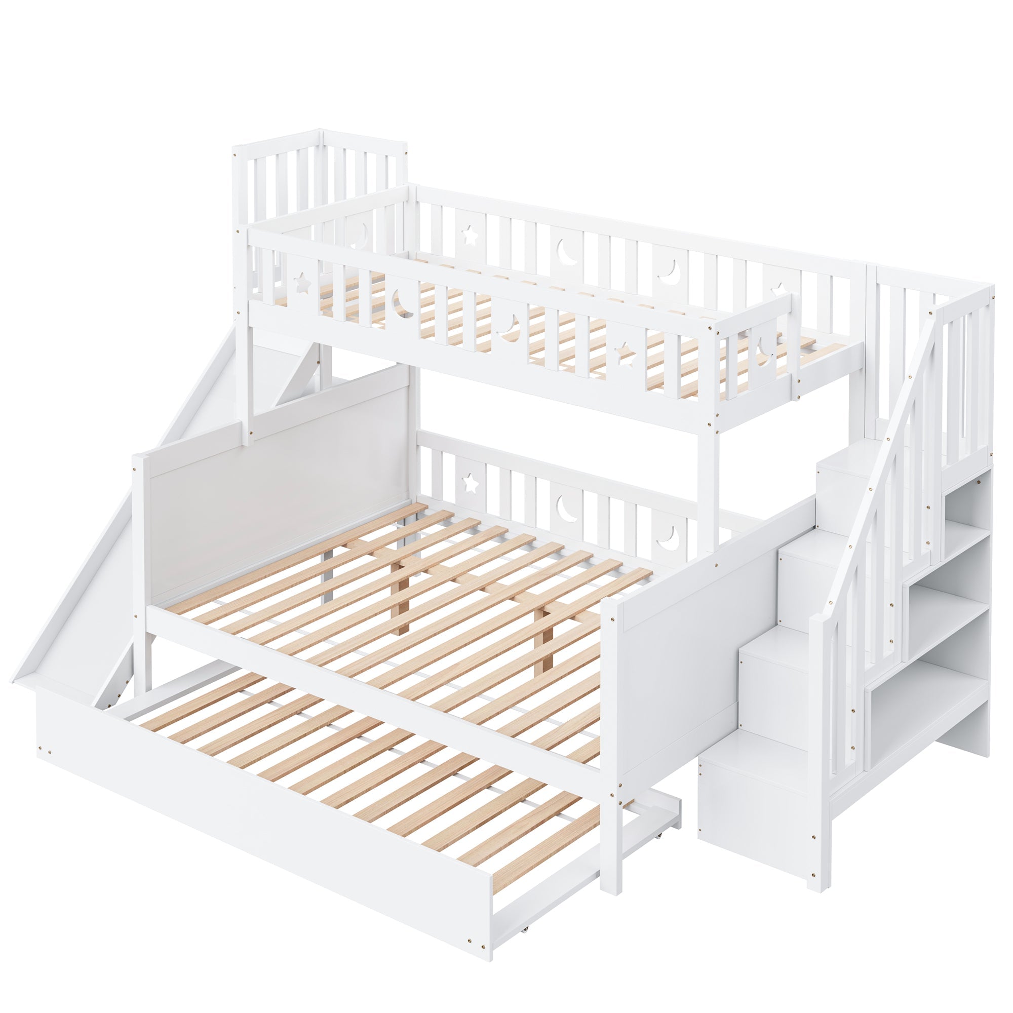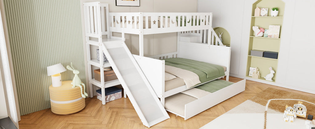 Children's Bed, Bunk with Slide, Shelf, Trundle & Slatted Frame, Solid Wood, White