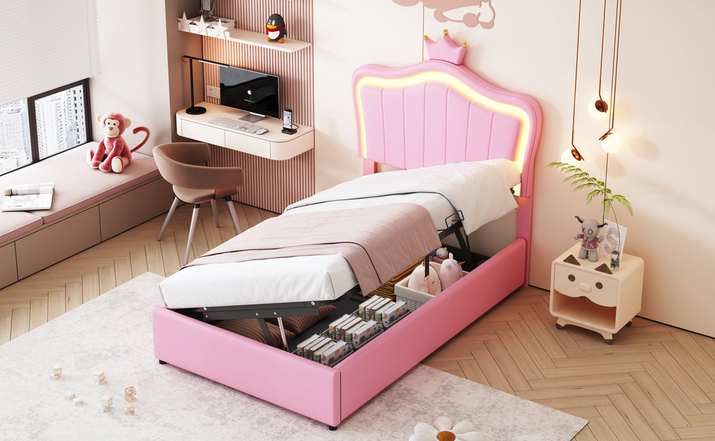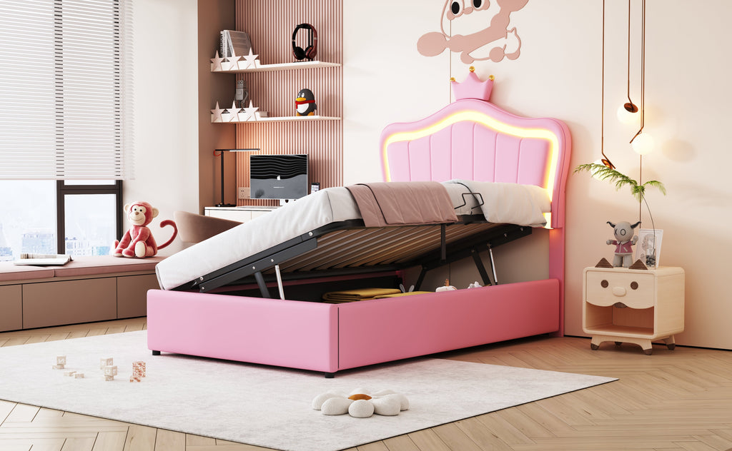 Children's Bed, Crown Design LED Hydraulic Storage, Faux Leather Pink