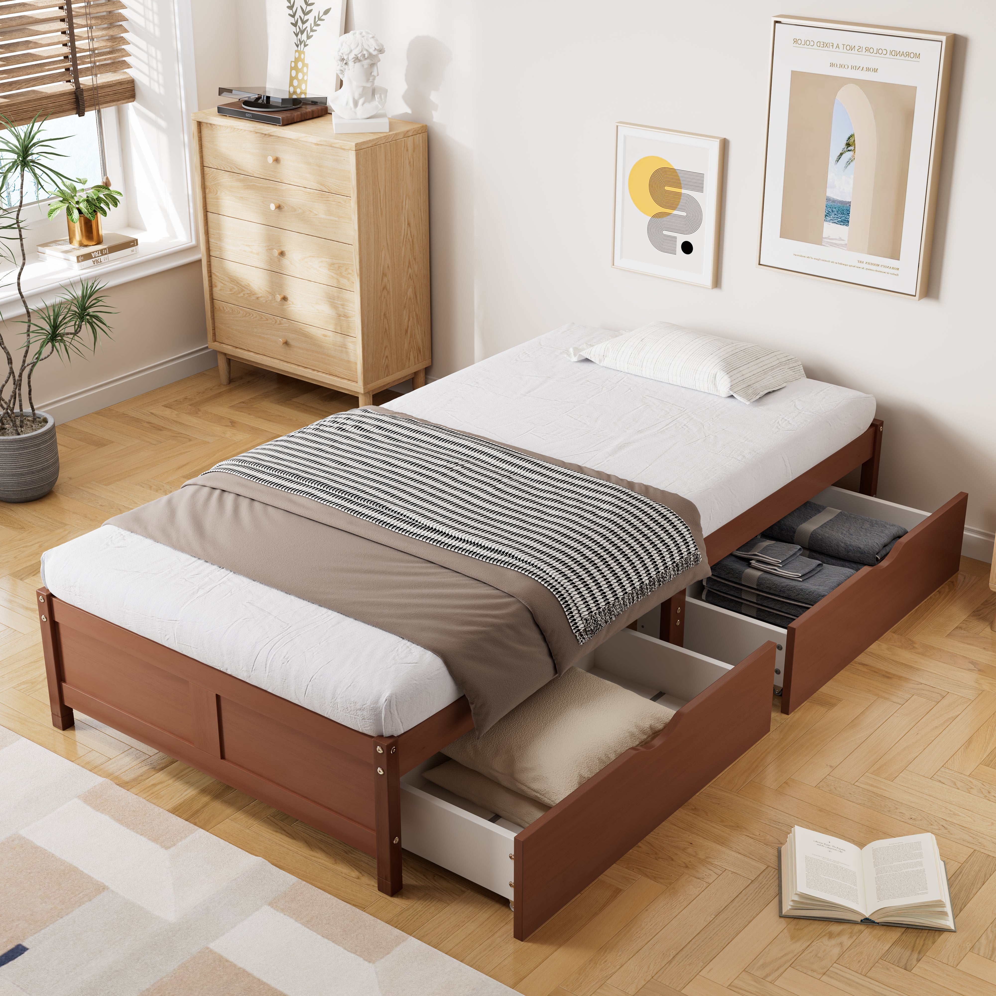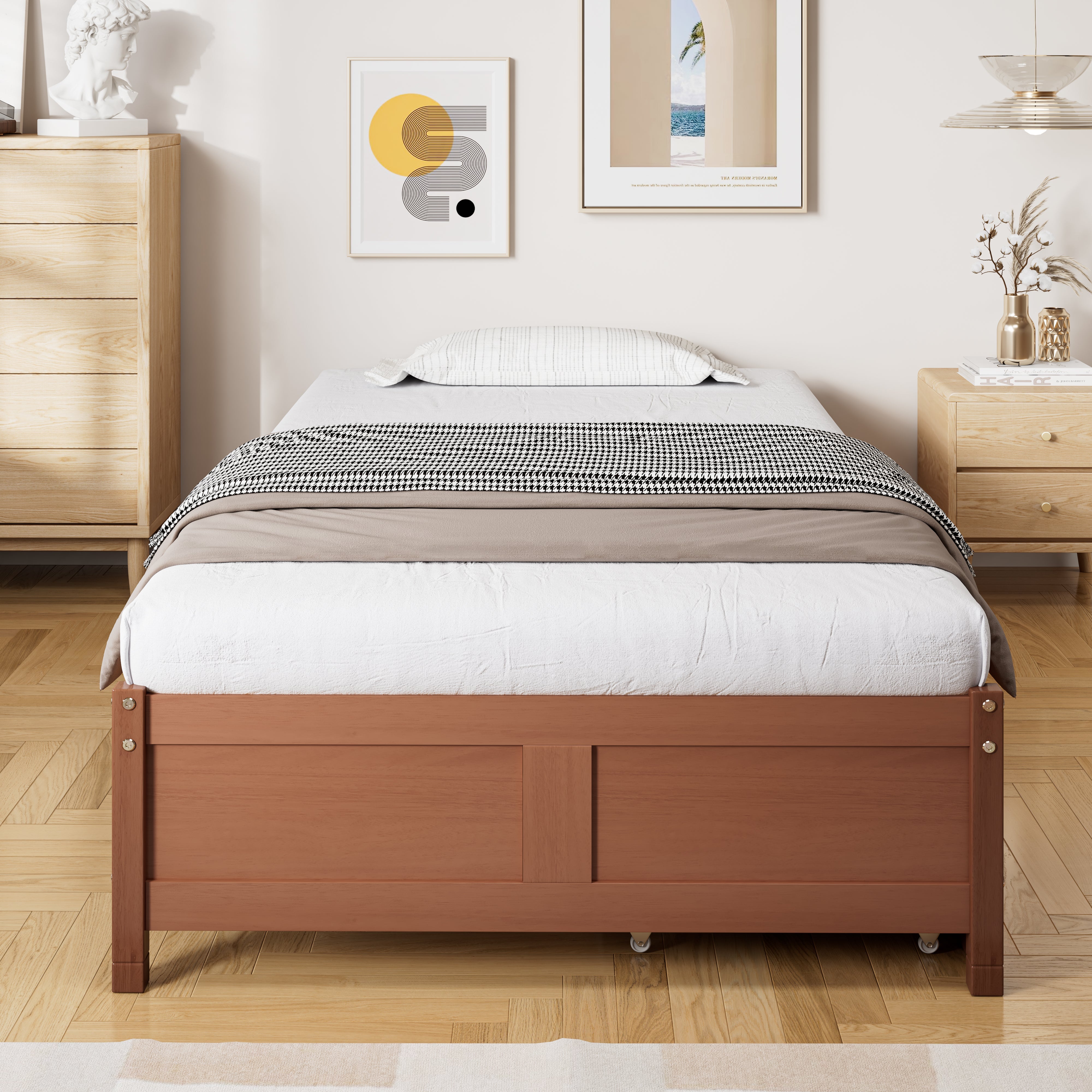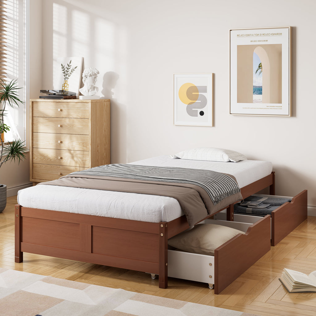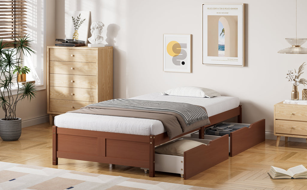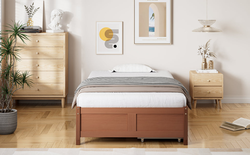 Children's Bed, Flat Bed, Wooden Bed, Vintage Wood Colors, Two Drawers with Wheels, Reddish Brown