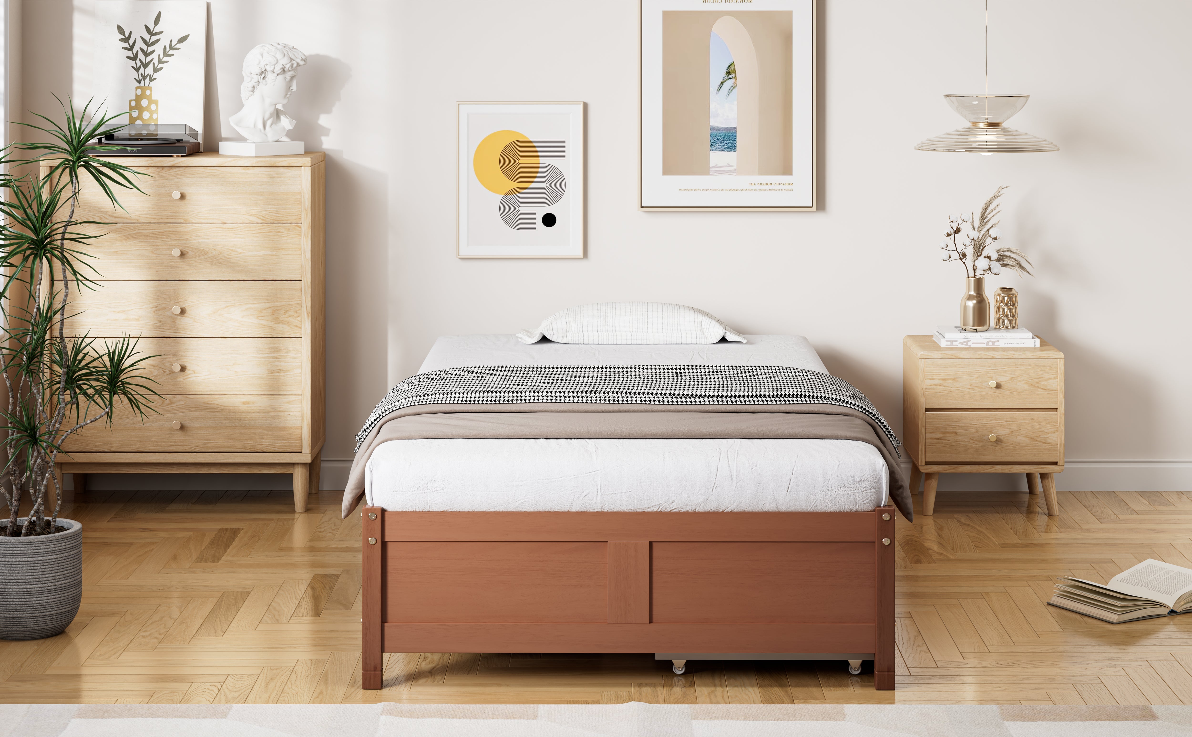 The mattress size for this flat bed is 90x200cm, with a recommended mattress thickness of 15cm. This flat wooden bed with drawers creates a sleeping environment that is both comfortable and aesthetically pleasing. It features a minimalist design, practical storage options, a solid support structure, high-quality materials, and a unique design aesthetic. The bed is designed to adapt to different needs and space requirements. The drawers can be moved from side to side, and the bed has a simple appearance without any hygienic corners. This design prevents dust and ensures a tidy room appearance, keeping your room clean.