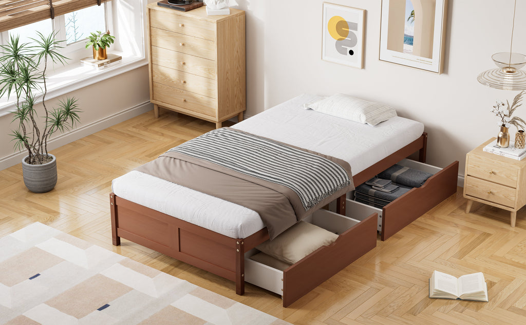 Children's Bed, Flat Wooden Bed with 2 Drawers, Pine+MDF Reddish Brown