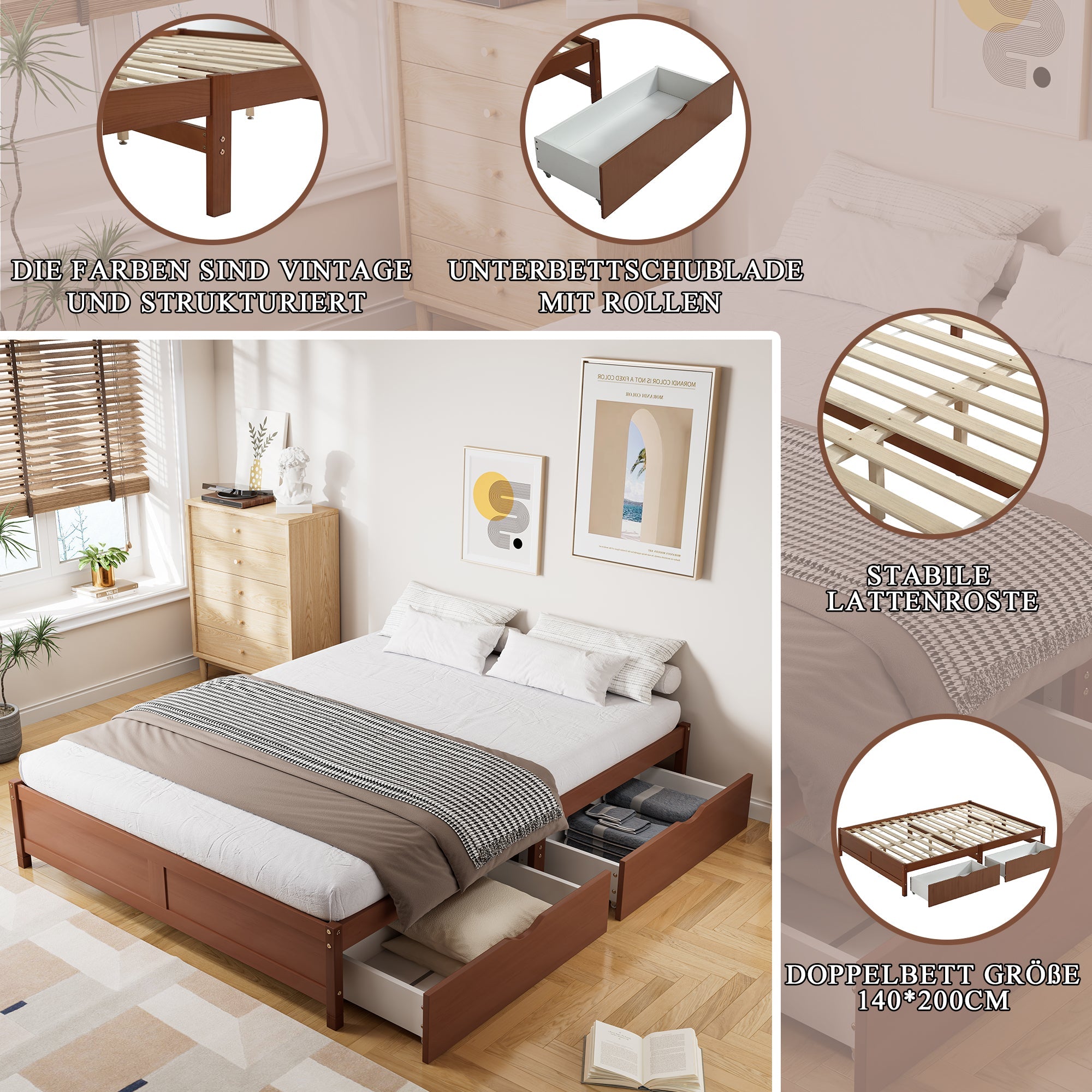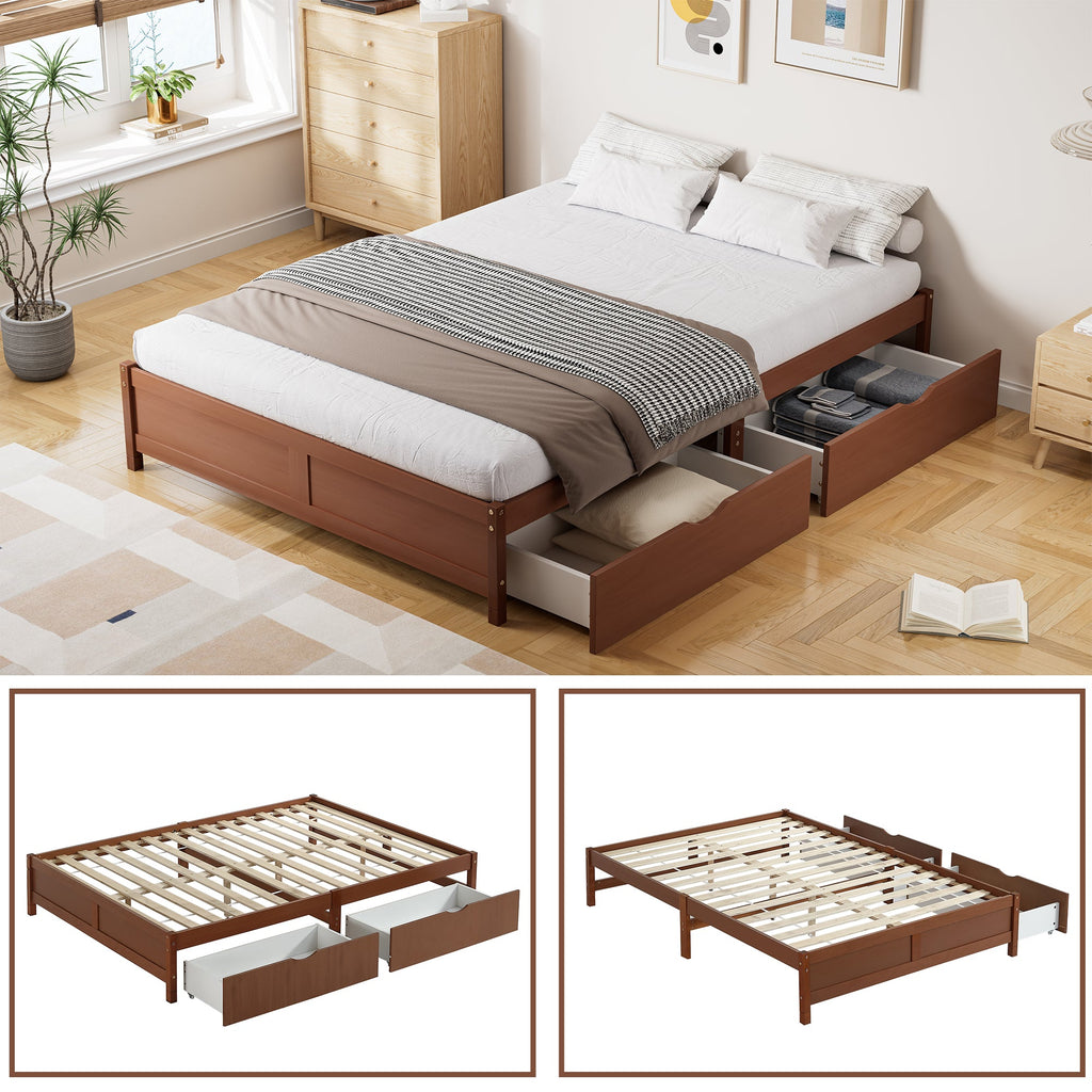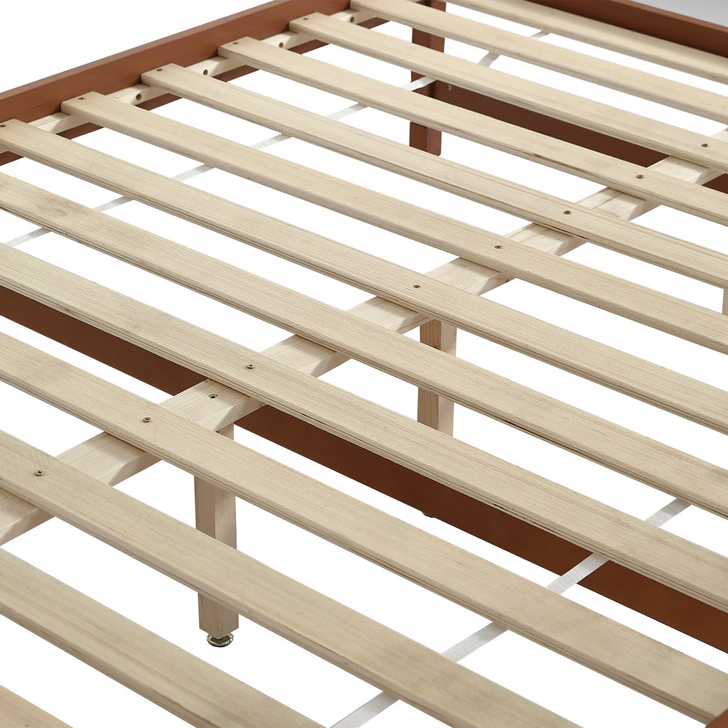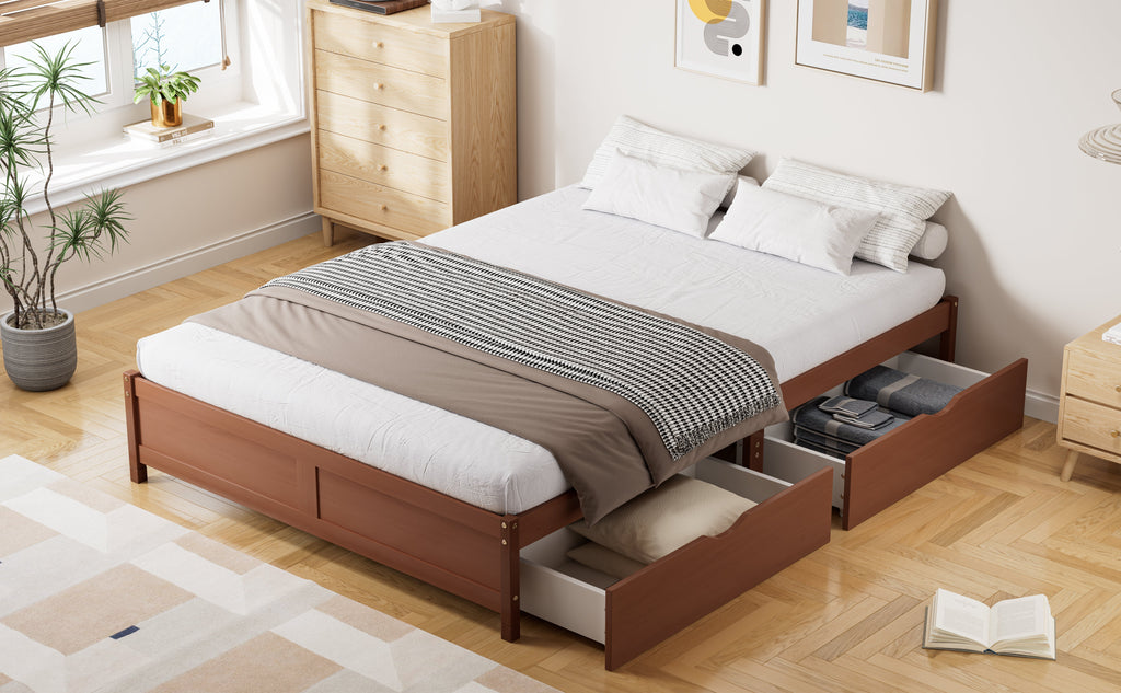 Children's Bed: Flat, Wooden, Vintage Wood Colors, Two Drawers with Wheels, Reddish Brown