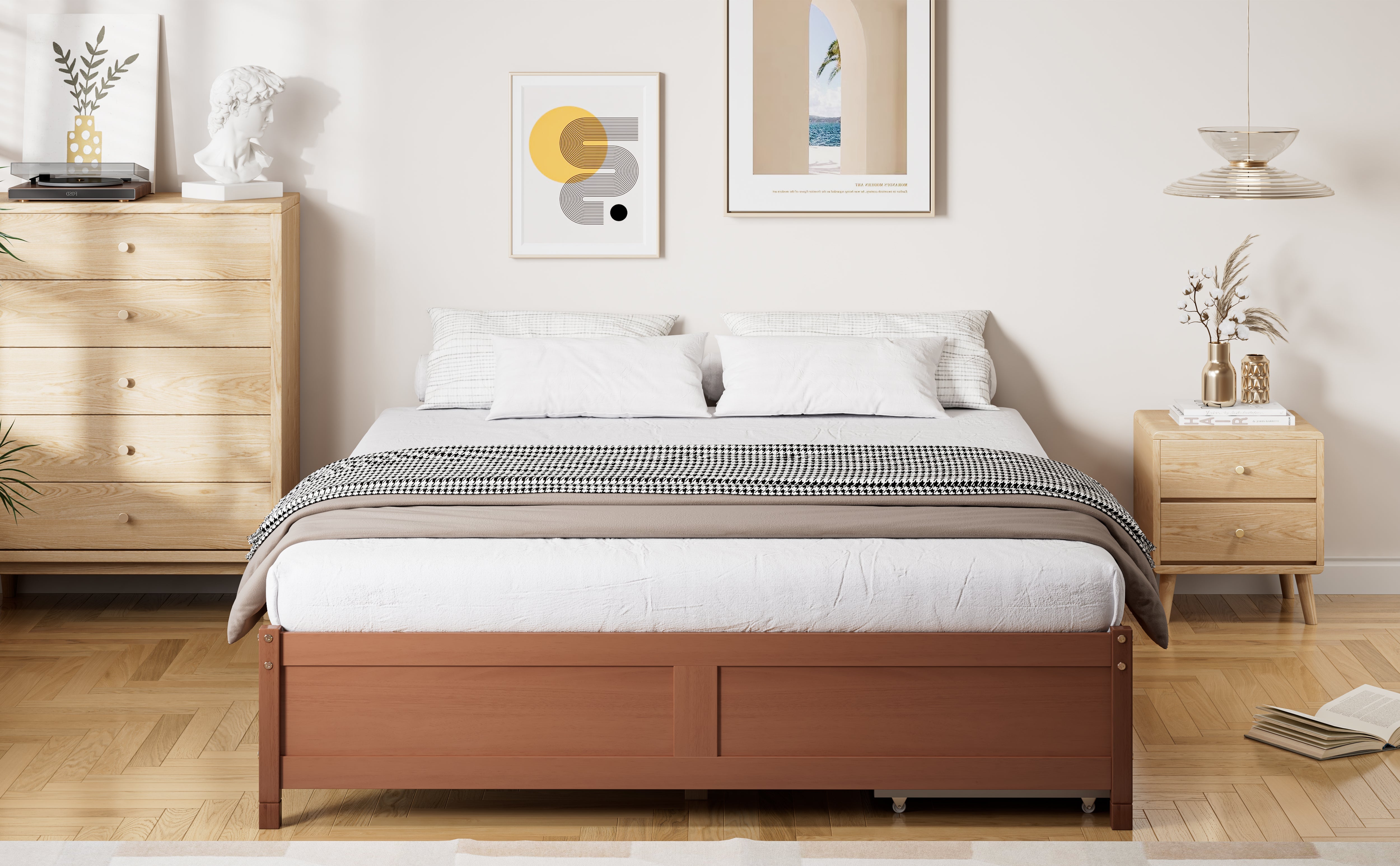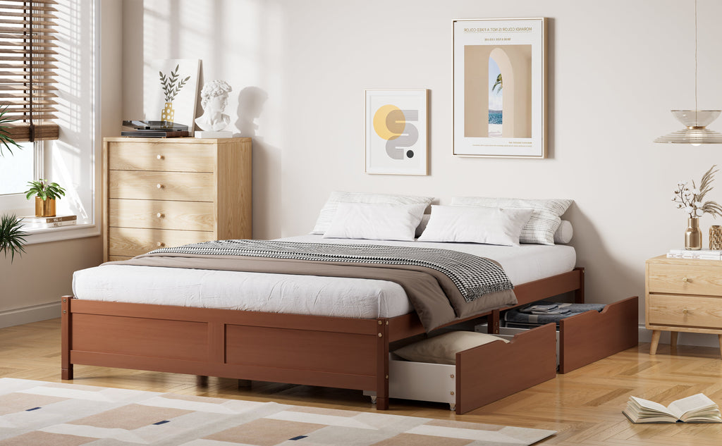 This flat wooden bed with drawers creates a sleeping environment that is both comfortable and aesthetically pleasing. It features a minimalist design, practical storage options, a solid support structure, high-quality materials, and a unique design aesthetic. The bed is designed to adapt to different needs and space requirements.