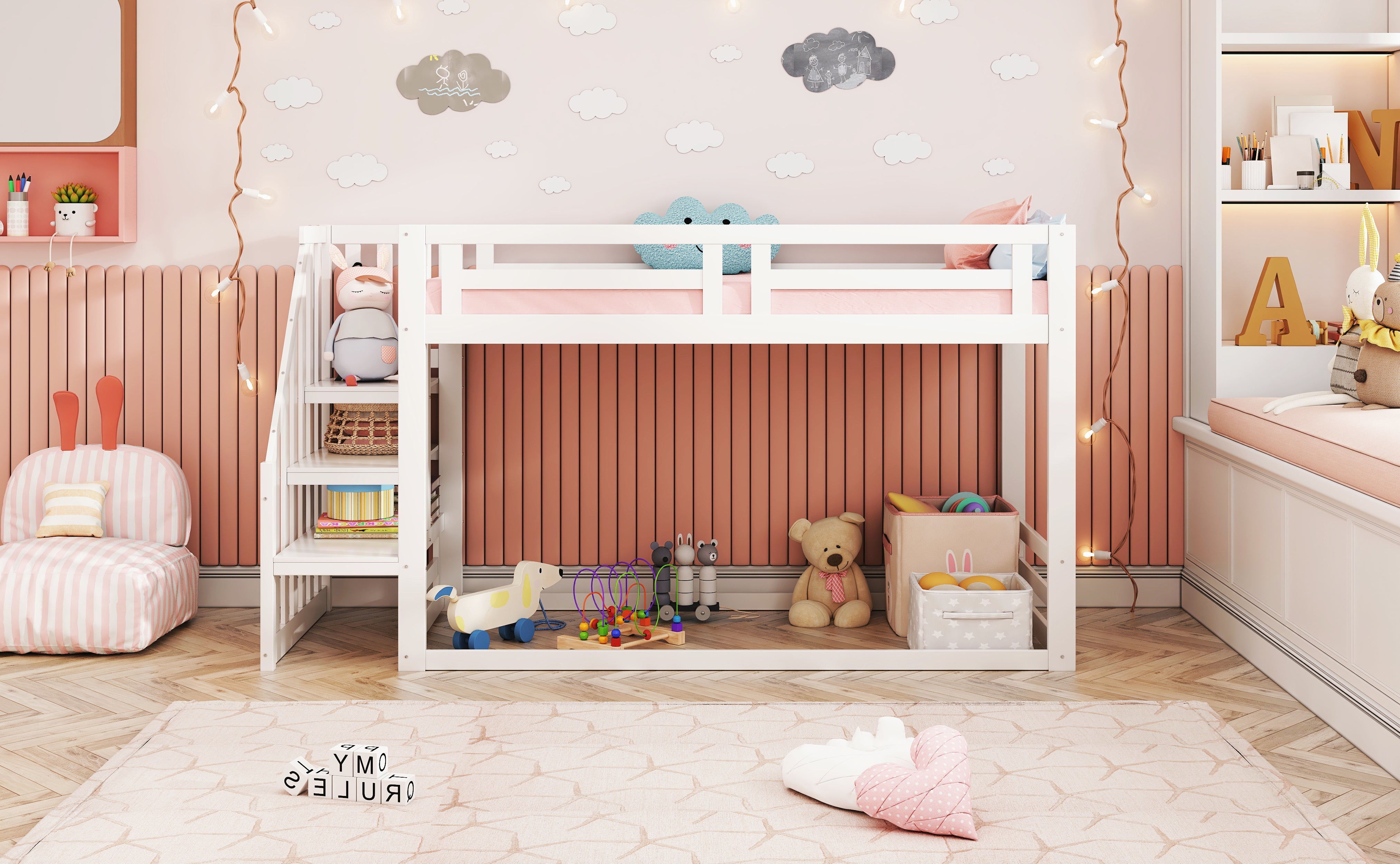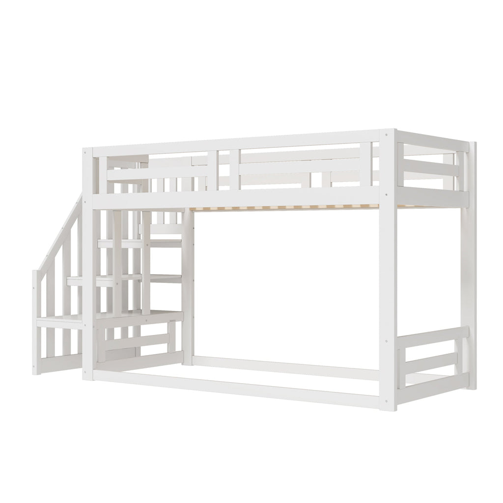 Children's Bed, Low Bunk with Safety Stairs, Solid Wood, White