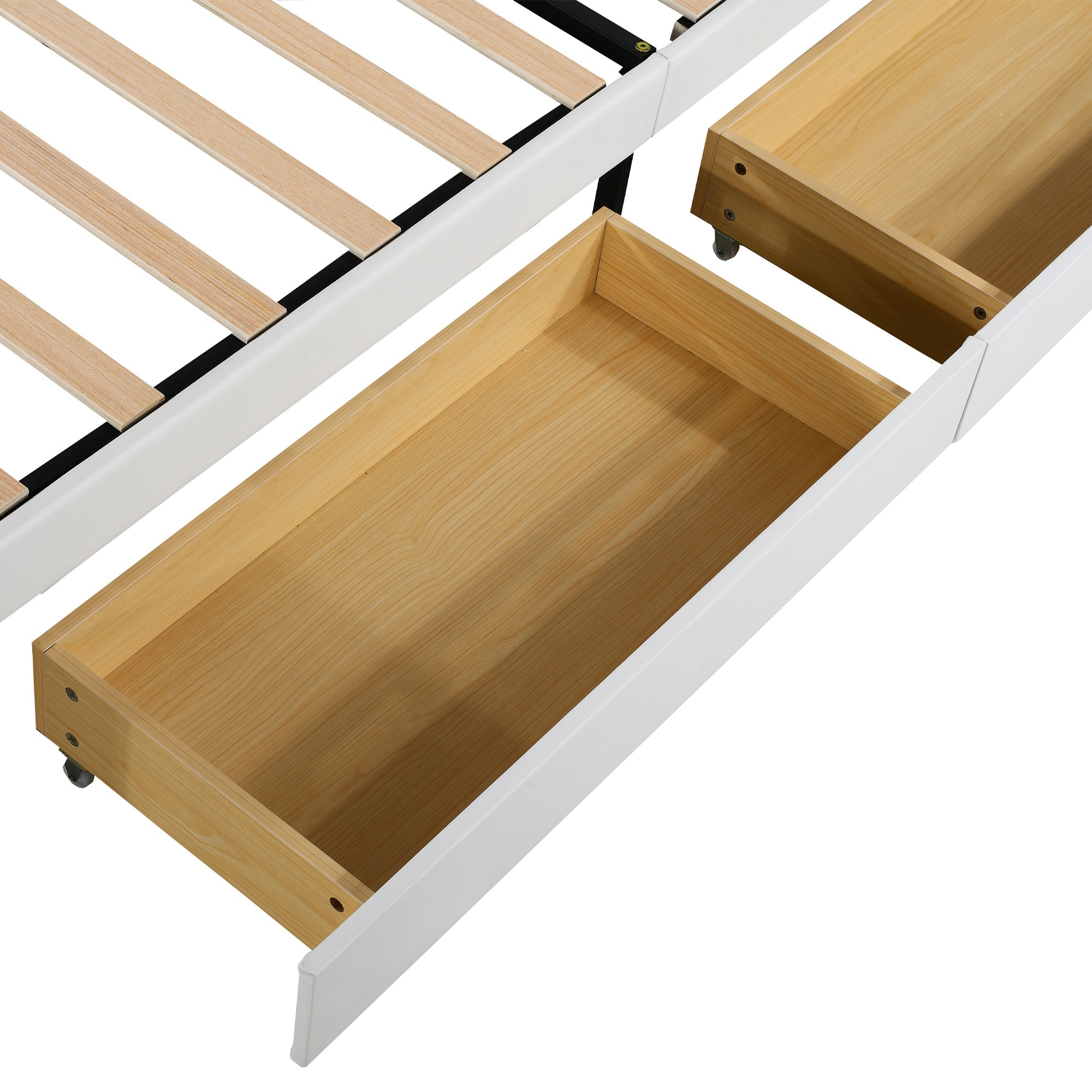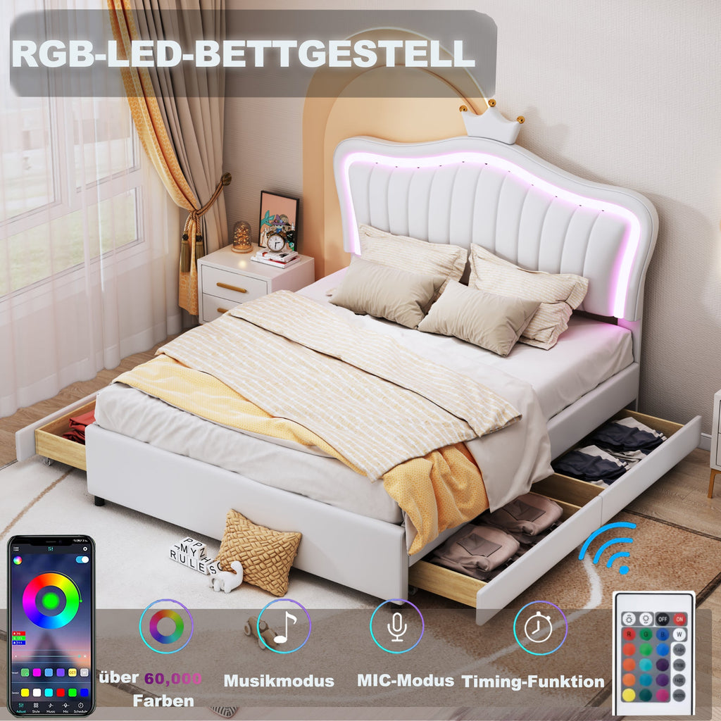 Children's Bed Upholstered with Storage Drawers & LED Lights, White PU Leather