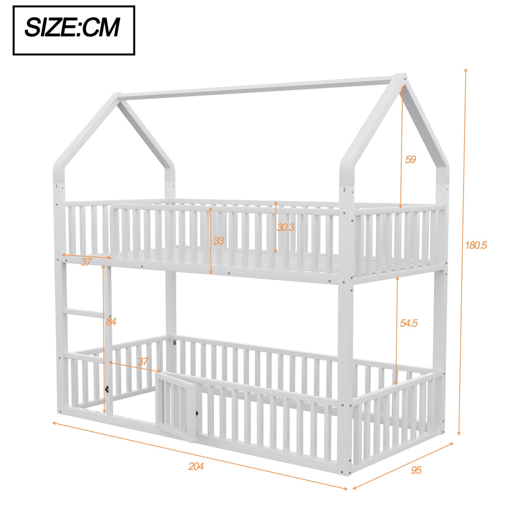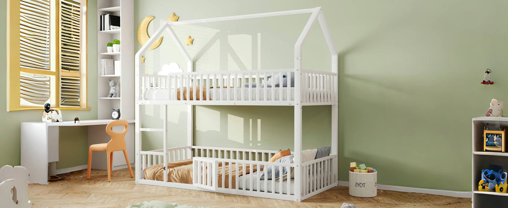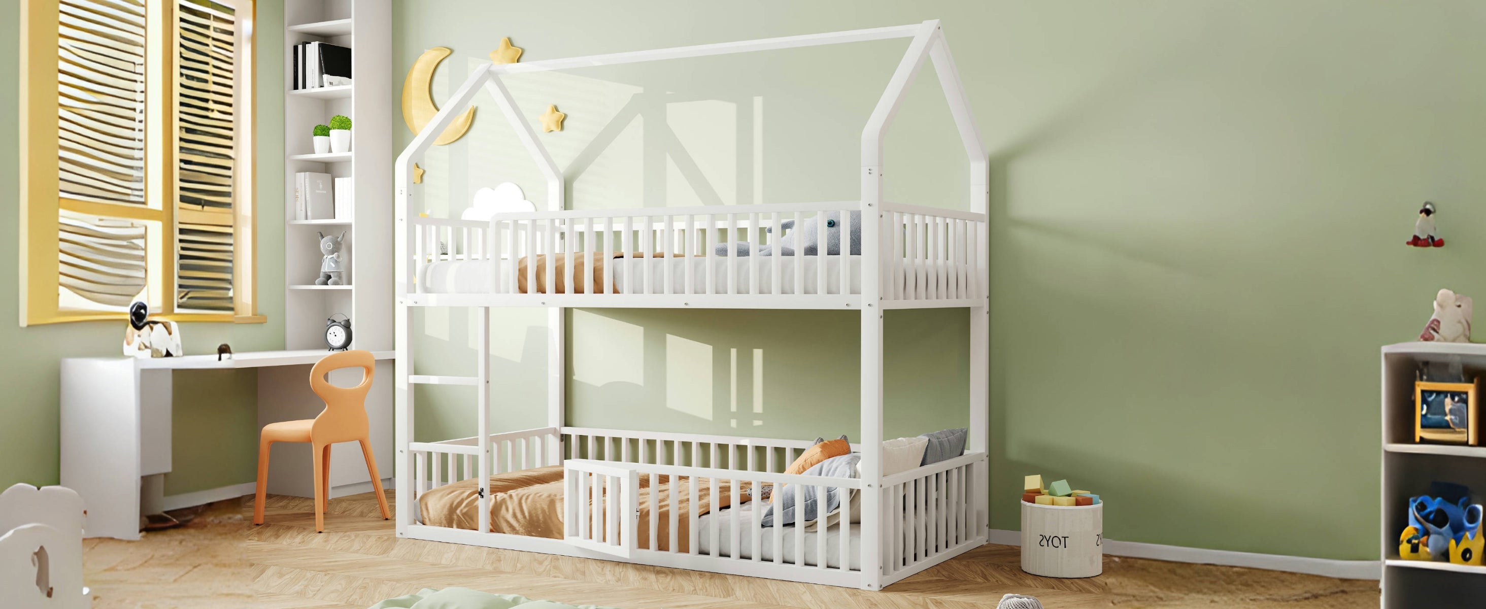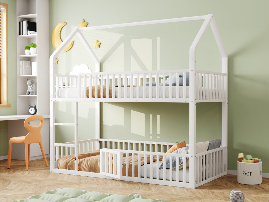 Safety is our top priority. Both the upper and lower beds are equipped with safety rails to ensure your children or guests can sleep securely. The upright front ladder allows for easy access to the upper bed, while the house-shaped frame of the upper bed encourages imagination and fun.