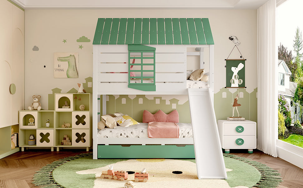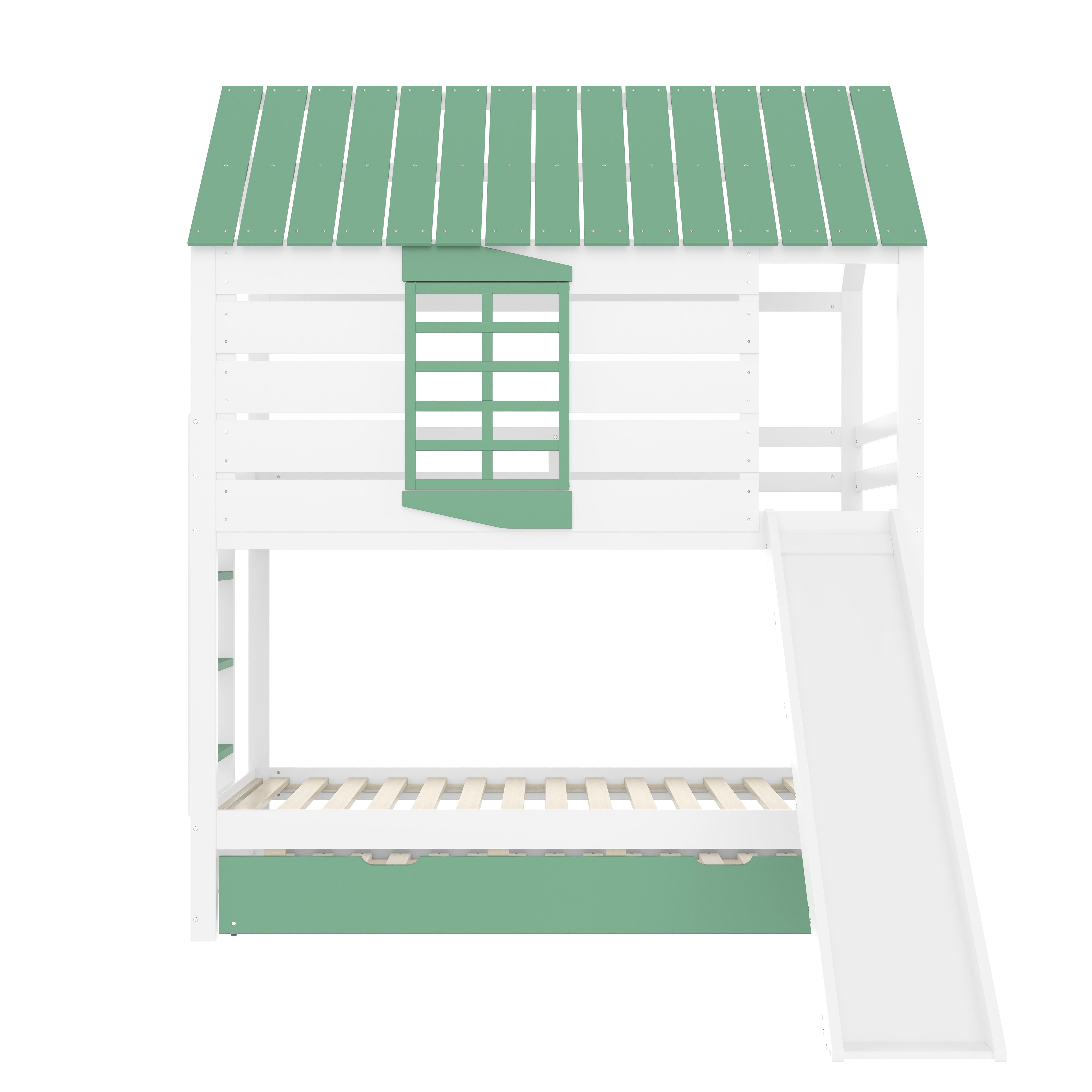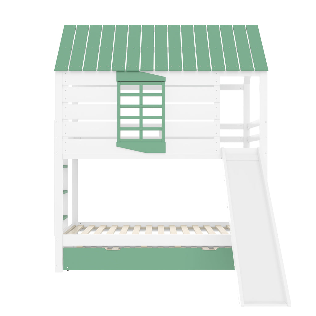 90x200 House Bunk Bed with Slide and Trundle Bed, White+Green