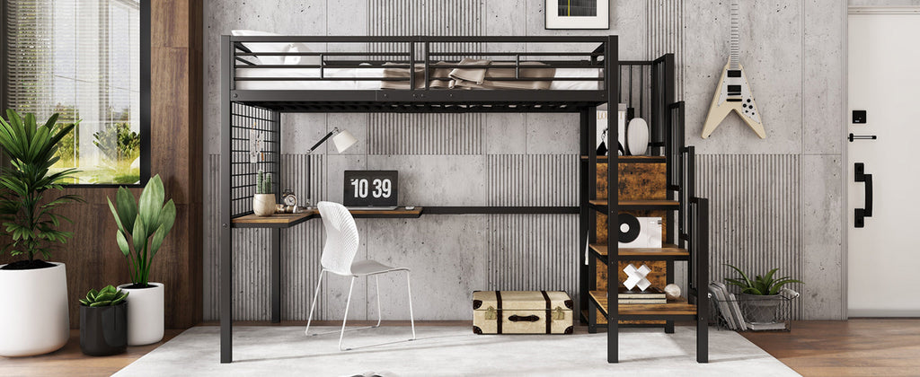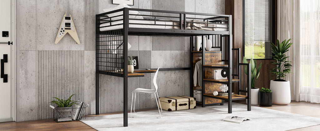 Iron Bunk Bed, Loft Bed with Table & Wardrobe, 90x200cm, Black Iron & Dark Wood