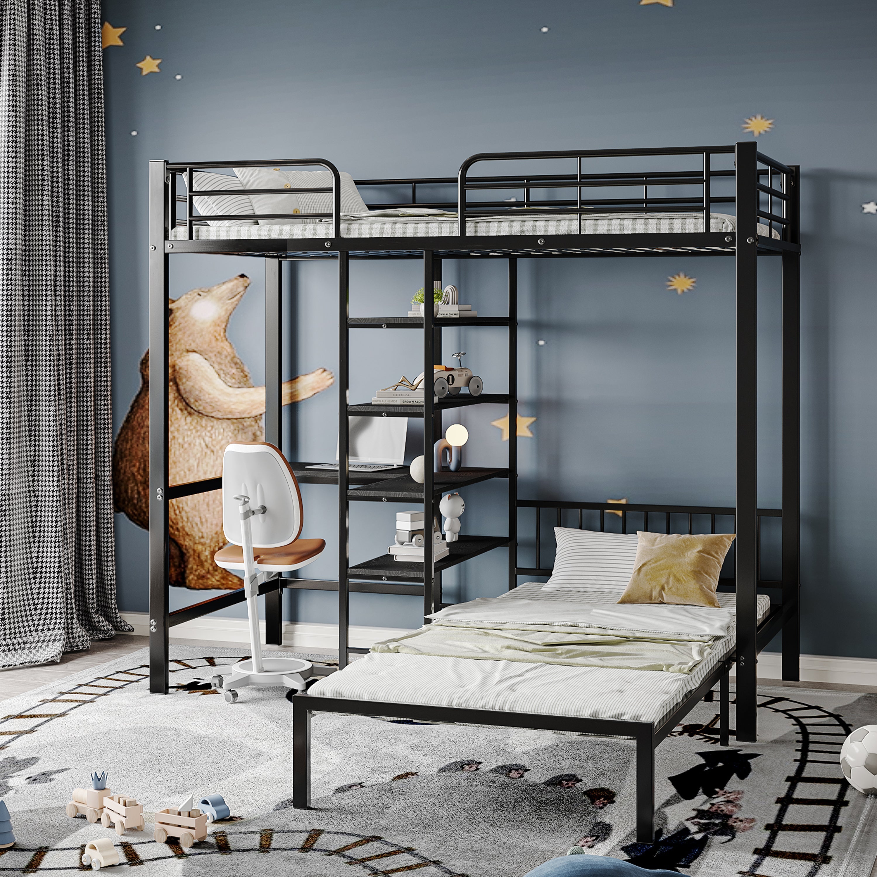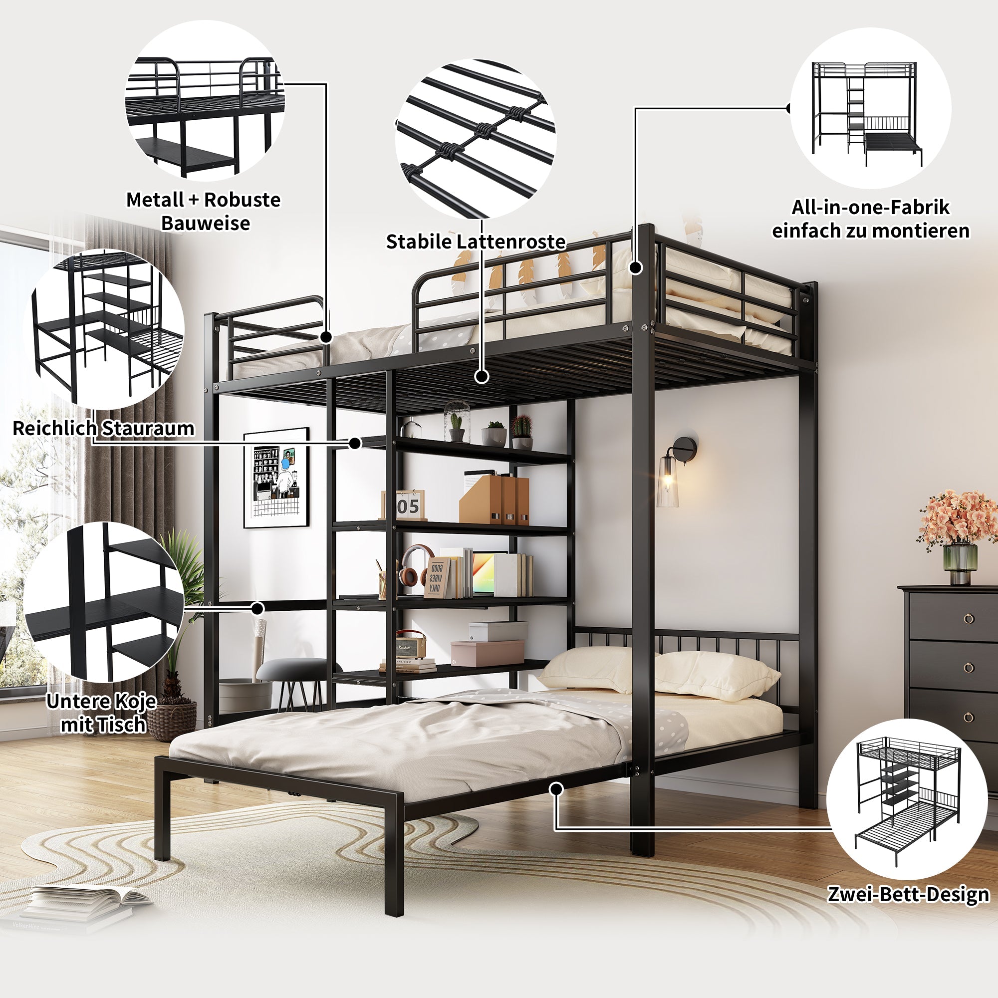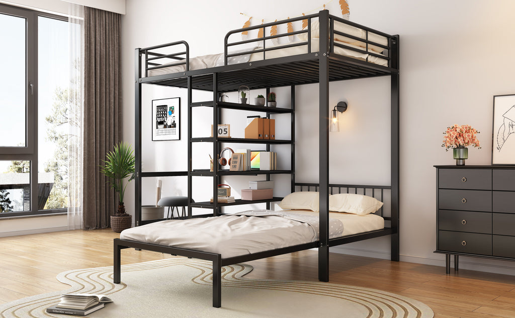 Iron Frame Bunk Bed, Table & Shelves, 90x200cm, Black Iron + MDF
