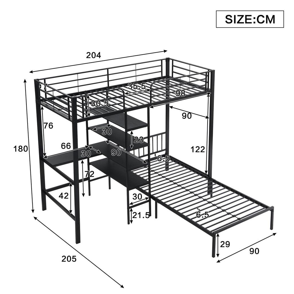 Iron Frame Bunk Bed with Table and Shelves, Iron + MDF, Black, 90x200cm