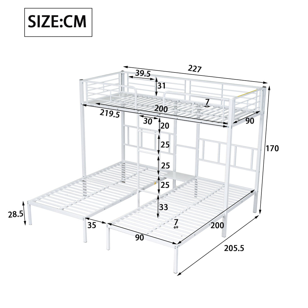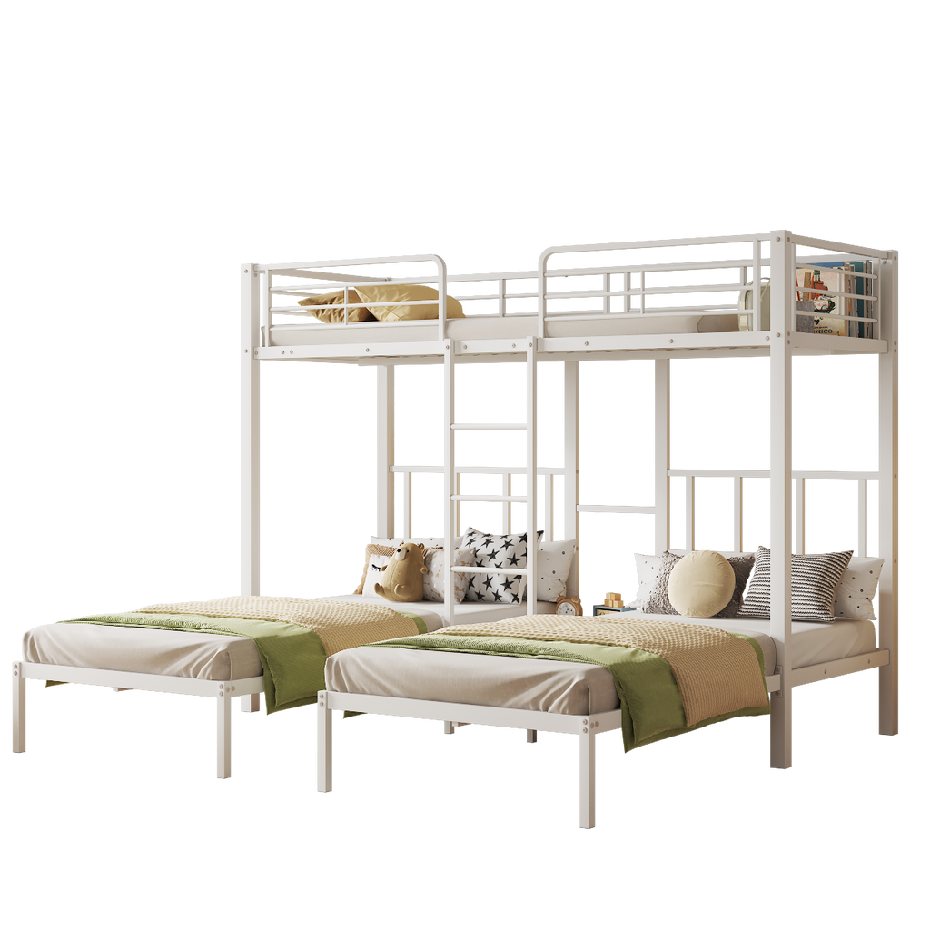Triple Bed, Bunk Bed with Ladder, Safety Rail & Table, Iron White
