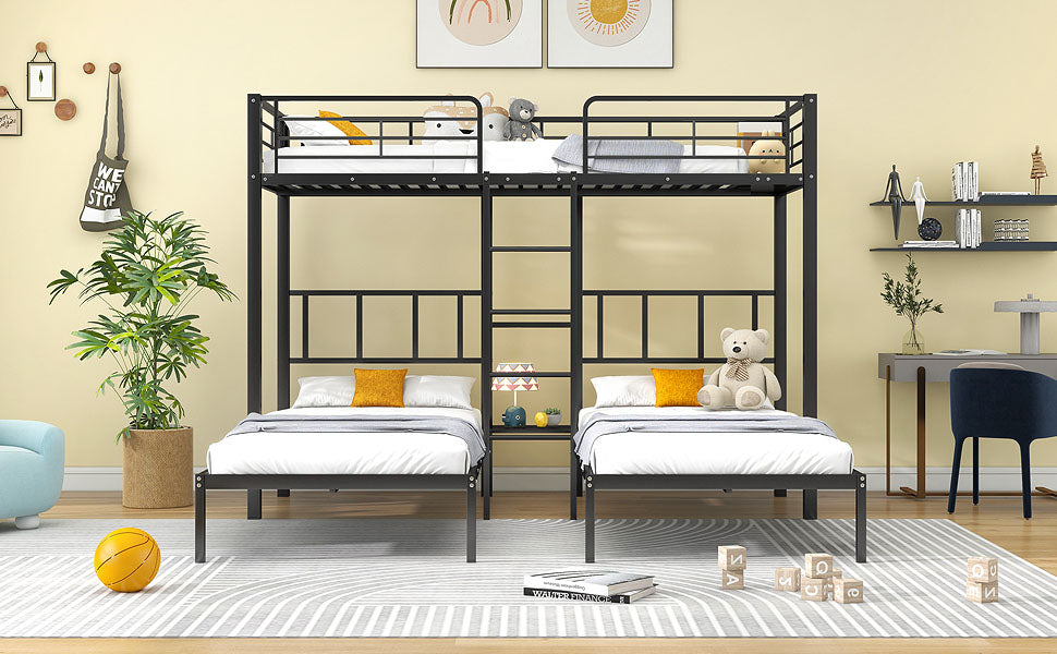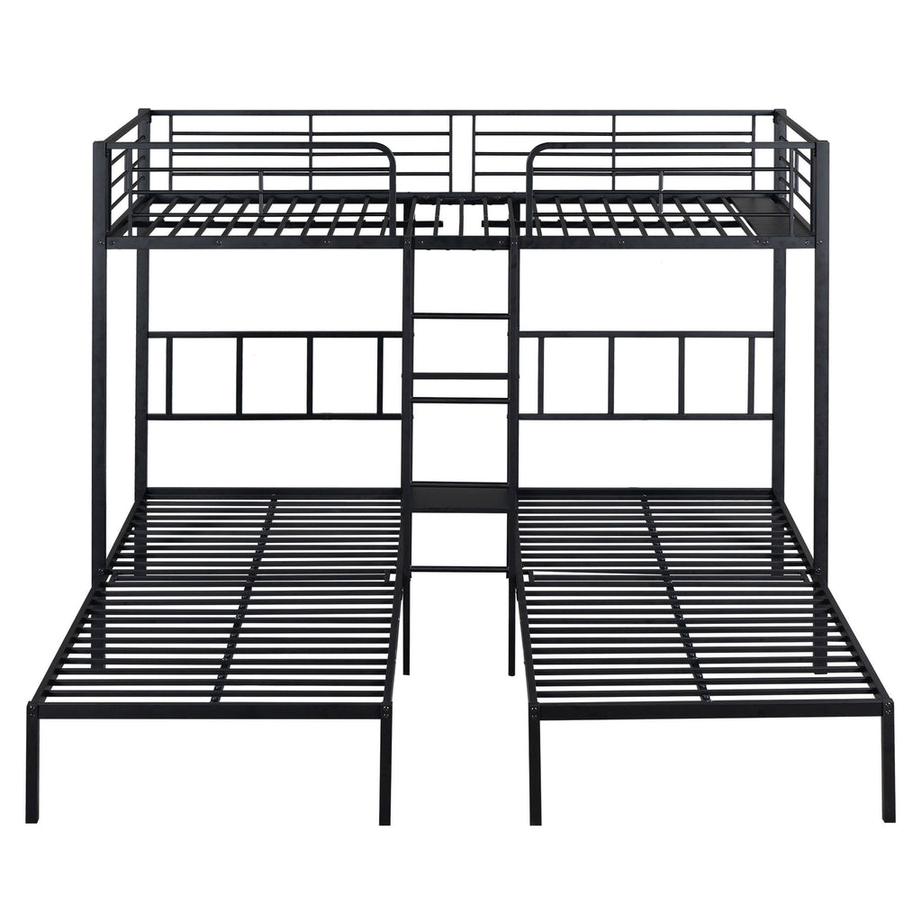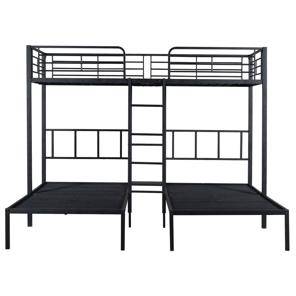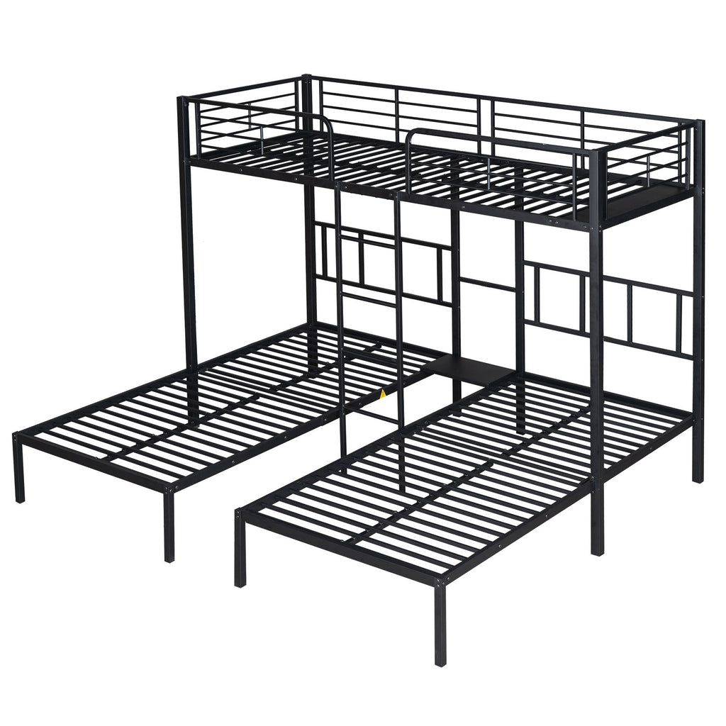 Triple Bunk Bed with Ladder, Safety Rail & Table, Black Iron