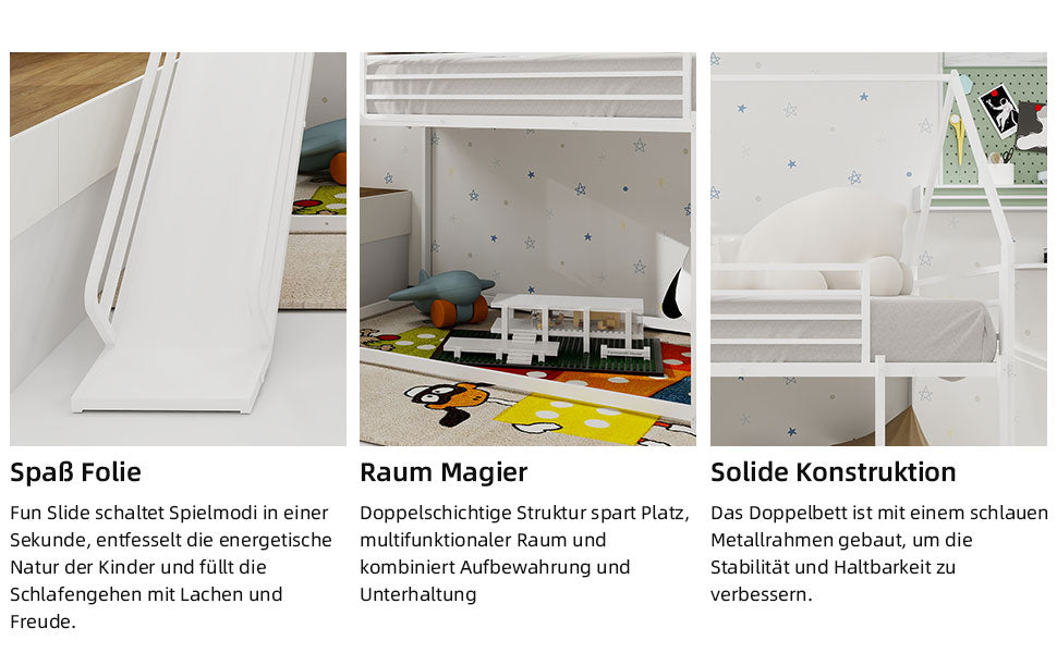 Whimsical Playhouse Design with Slide: This bunk bed for two turns bedtime into an adventure! With its fun playhouse design and attached slide, it inspires imaginations while providing a cozy place for children to sleep.