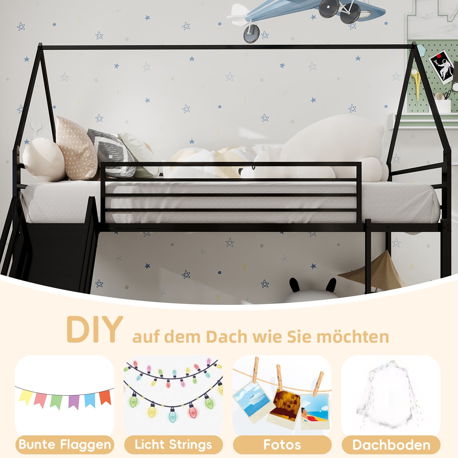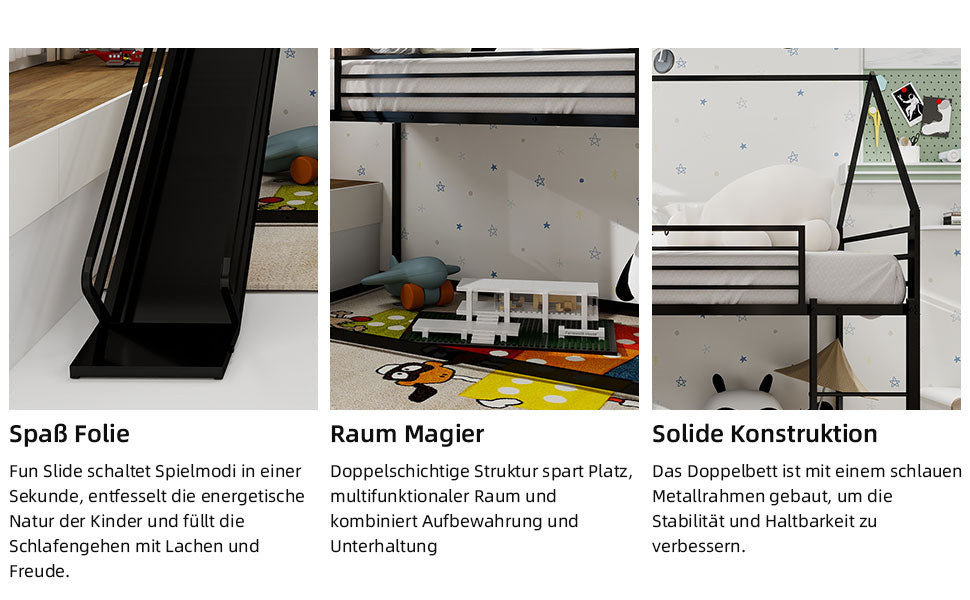 Whimsical Playhouse Design with Slide: This bunk bed for two turns bedtime into an adventure! With its fun playhouse design and attached slide, it inspires imaginations while providing a cozy place for children to sleep.
