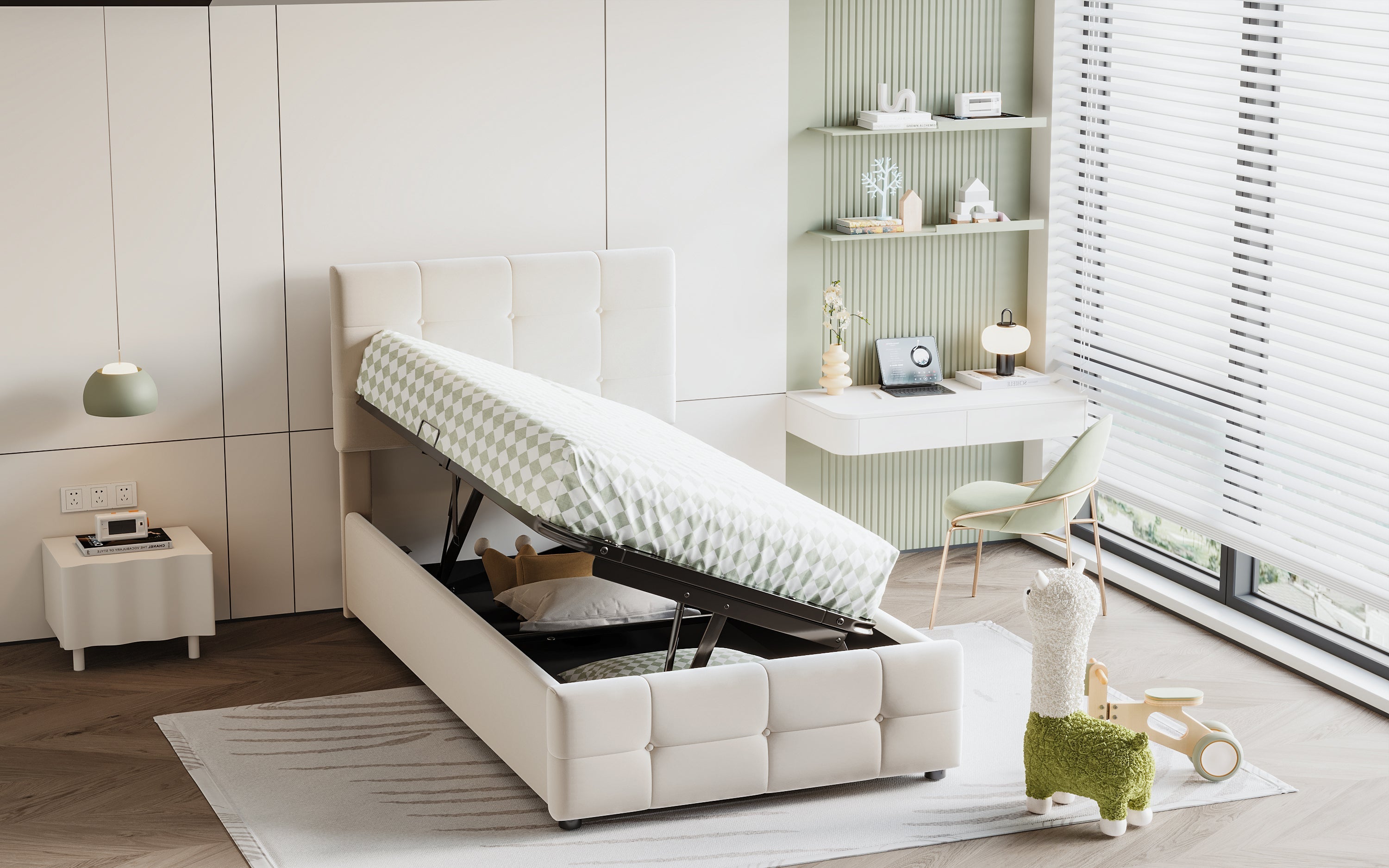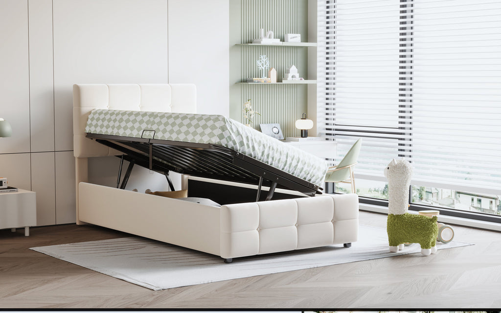 Crafted from a soft, skin-friendly velvet fabric, this upholstered bed provides a cozy and comfortable sleeping environment. The hydraulic storage system offers a practical solution for organizing the room. Simply lift the mattress to access the spacious storage compartment underneath, perfect for storing bedding, toys, and clothes. This innovative design maximizes space without compromising on style.