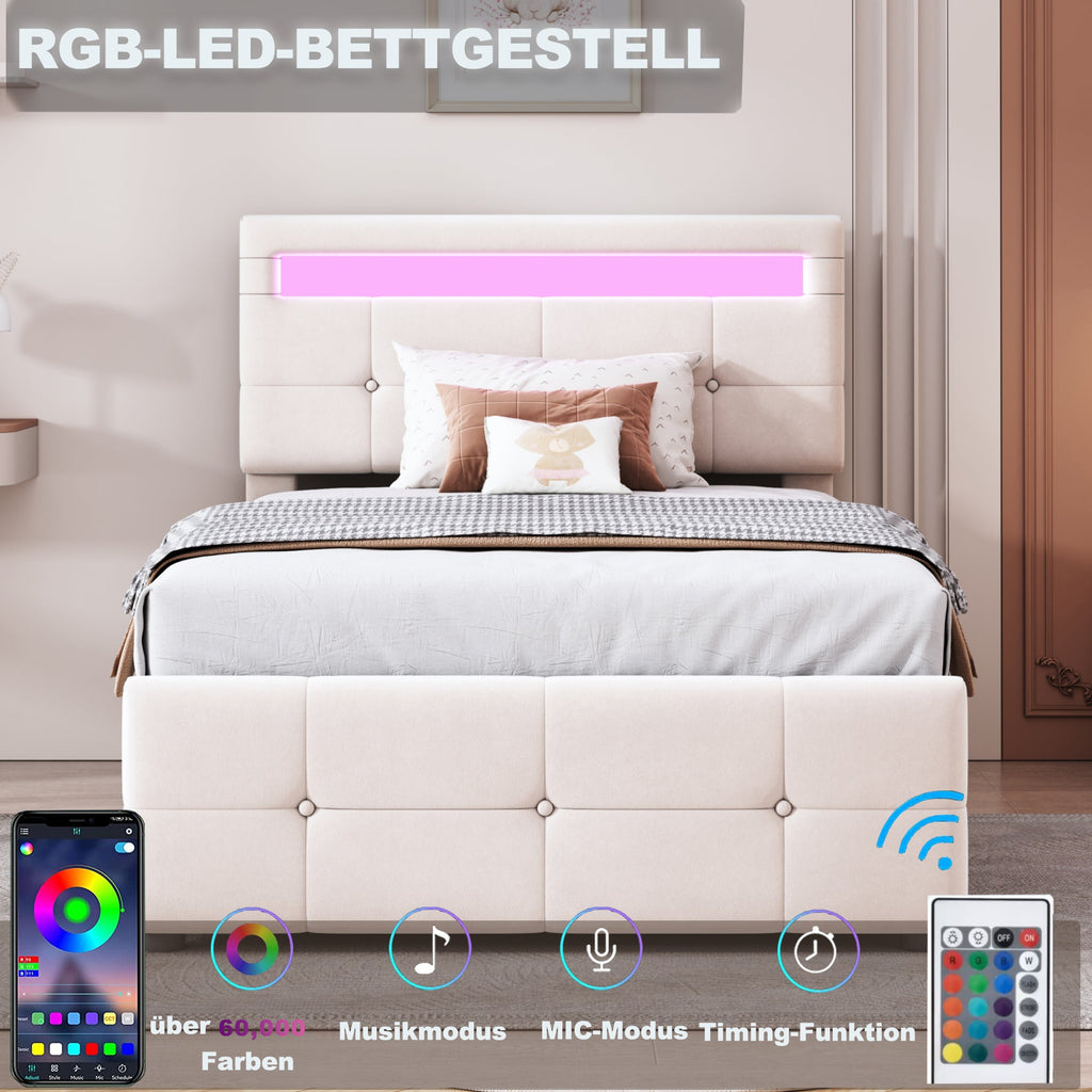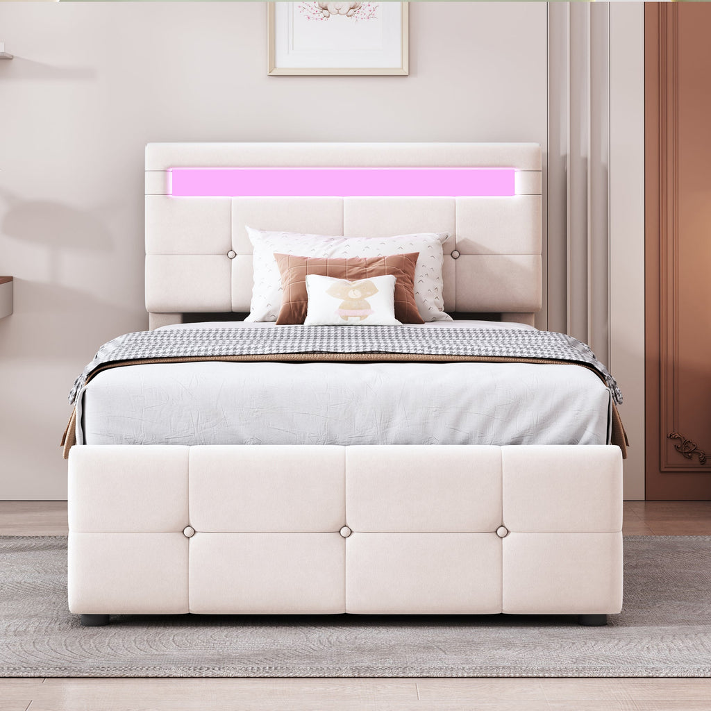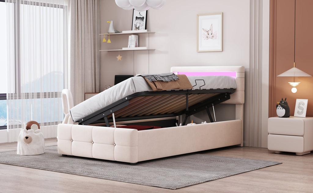 Upholstered Children's Bed 90x200cm, LED, Hydraulic Storage, Adjustable Headboard, Velvet Beige