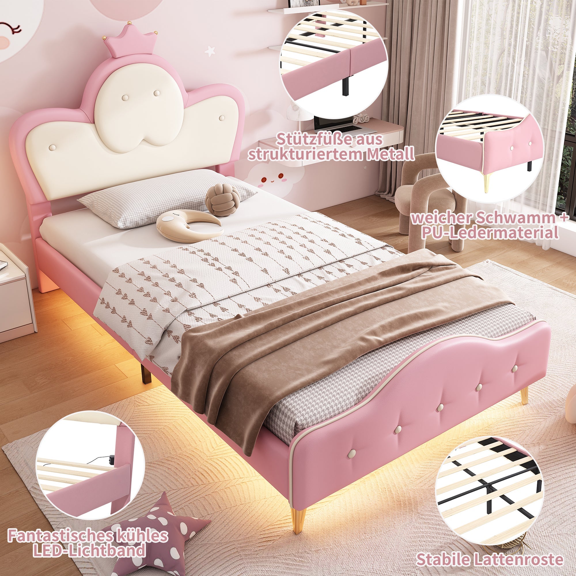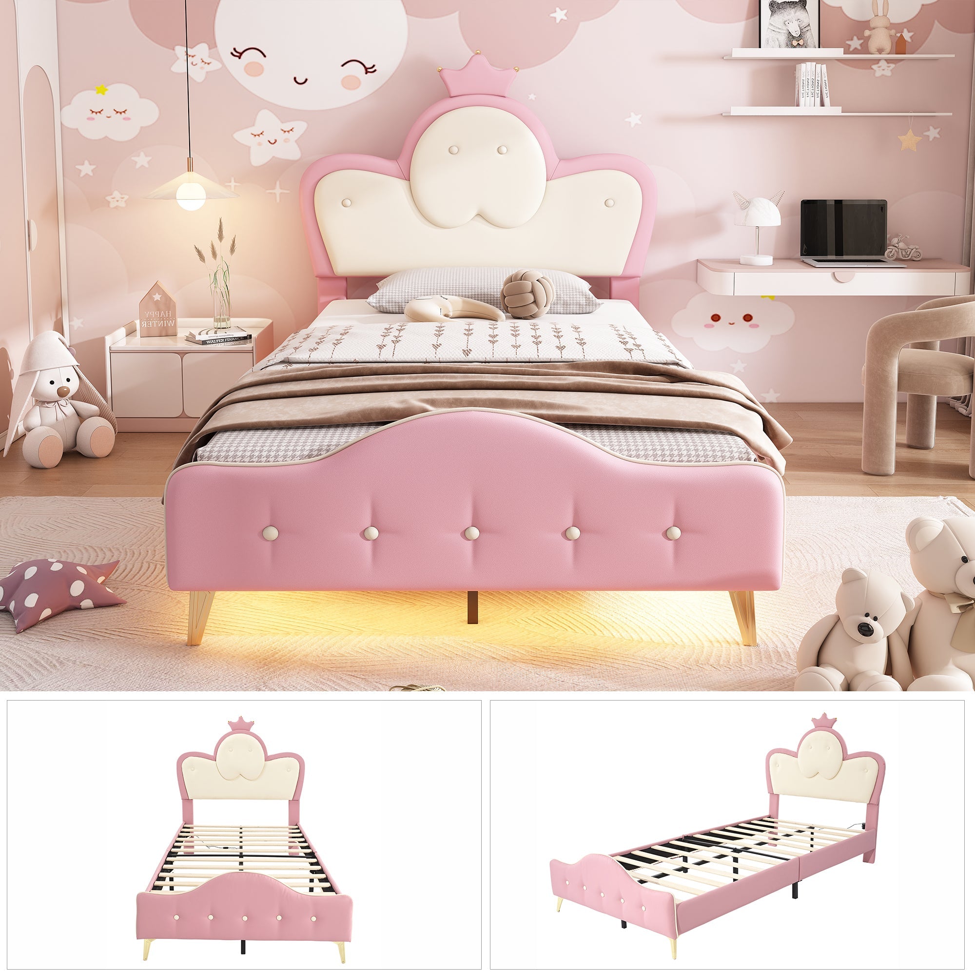 Upholstered Children's Bed with Crown Headboard, LED Strip, PU, Pink + White