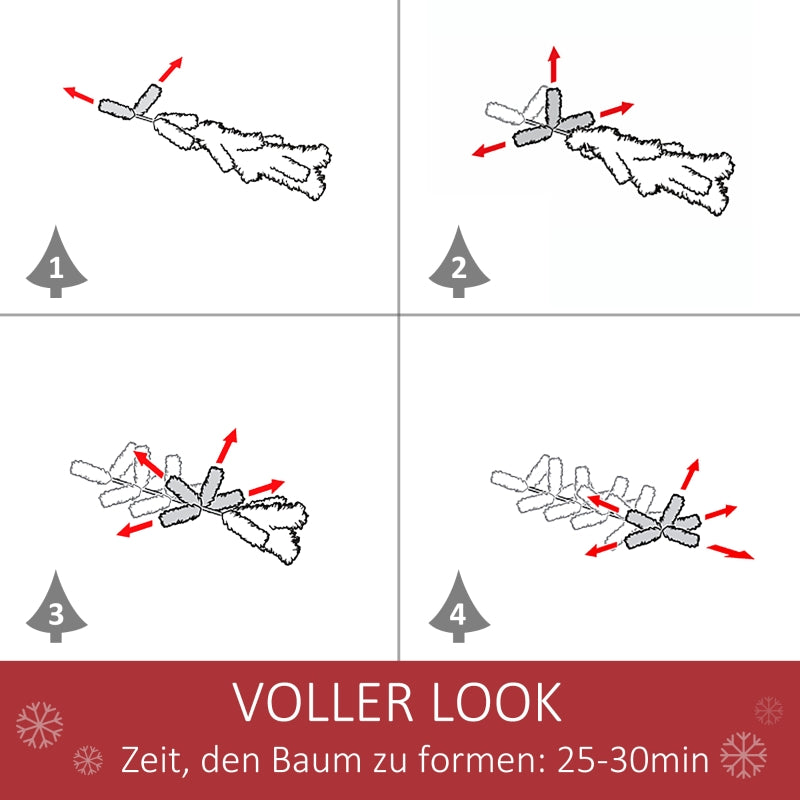 Total dimensions of the Christmas tree: Ø90 x 180H cm. For a particularly lifelike appearance, unfold each tip individually, which takes approximately 25-30 minutes. Decorations are not included.
