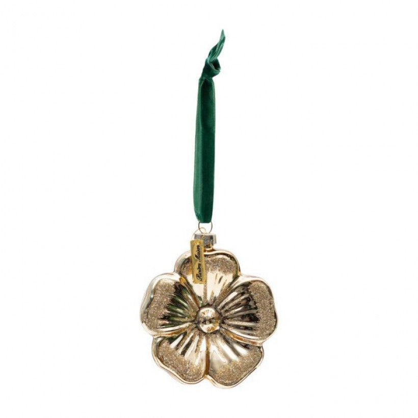 The Christmas Flower Ornament gold is a gold-coloured Christmas ornament of glass. This glossy Christmas tree decoration is shaped like a flower and comes decorated with glitter. The ornament hangs on a green suspension ribbon. Available in several colours.