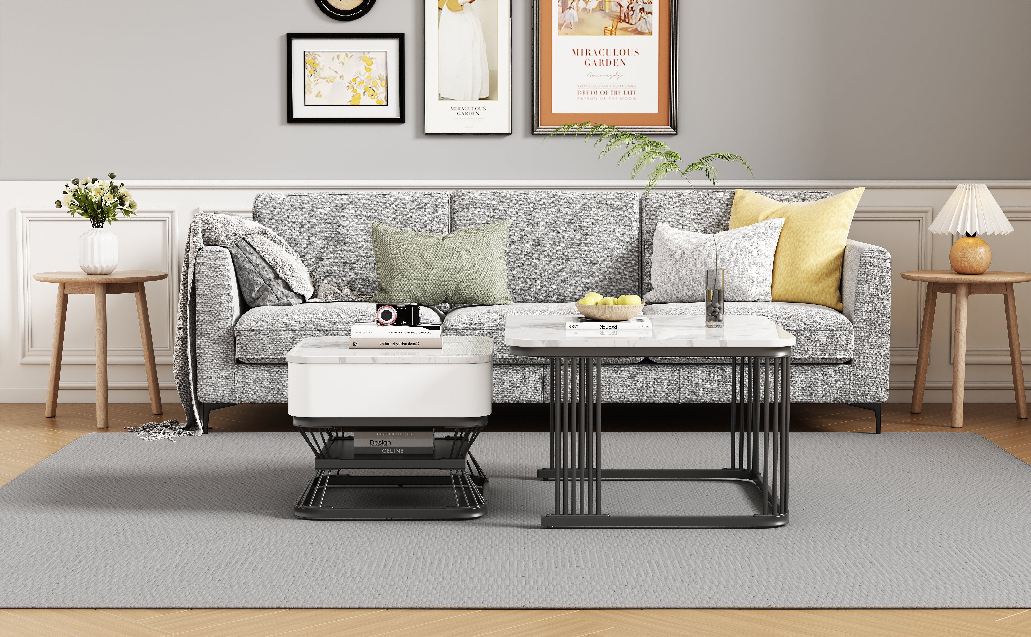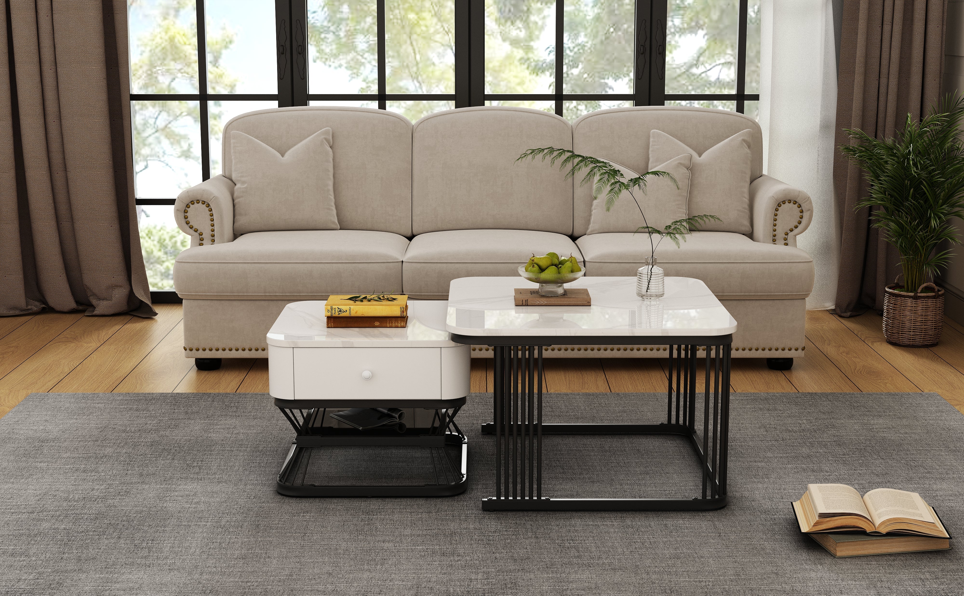 This 2-piece geometric coffee table set features a high-gloss, marble-effect tabletop (not real marble or slate) that is durable and easy to clean, making it an excellent choice for smaller living rooms. The stylish look perfectly complements modern, minimalist decor. The black metal frame adds an elegant touch and a hint of mystery to your living room ambiance. It includes one drawer for storage.